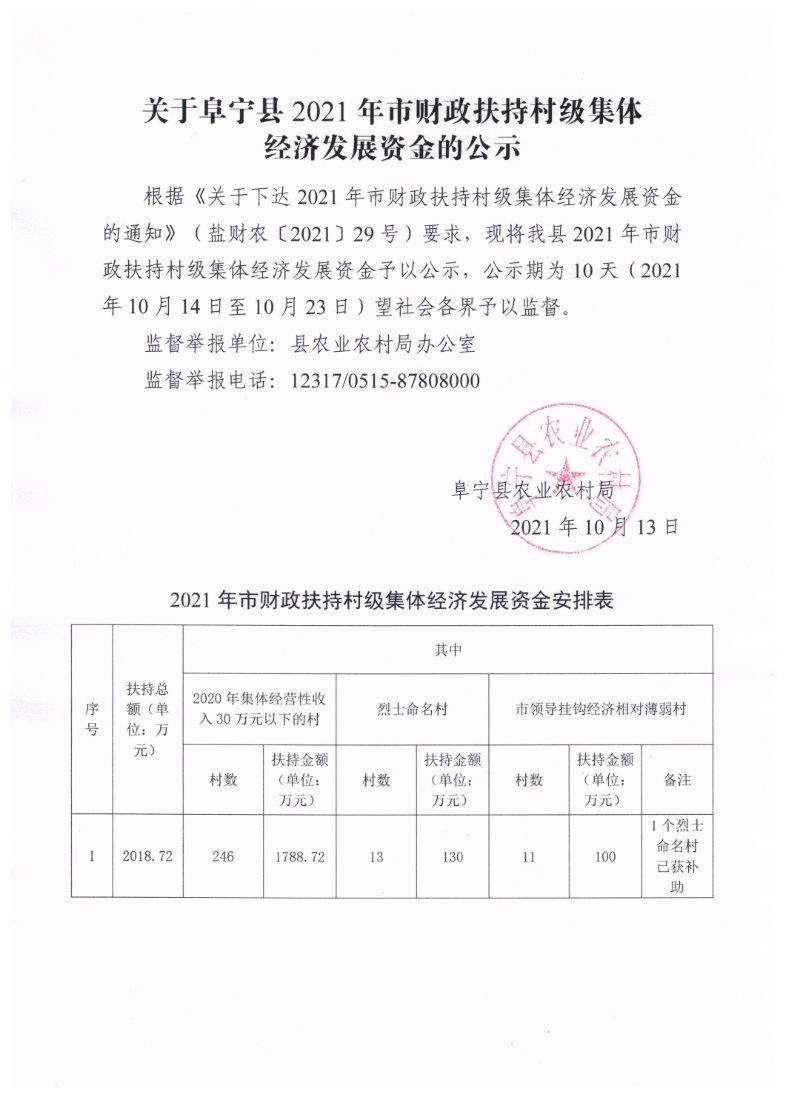关于阜宁县2021年市财政扶持村级集体经济发展资金的公示