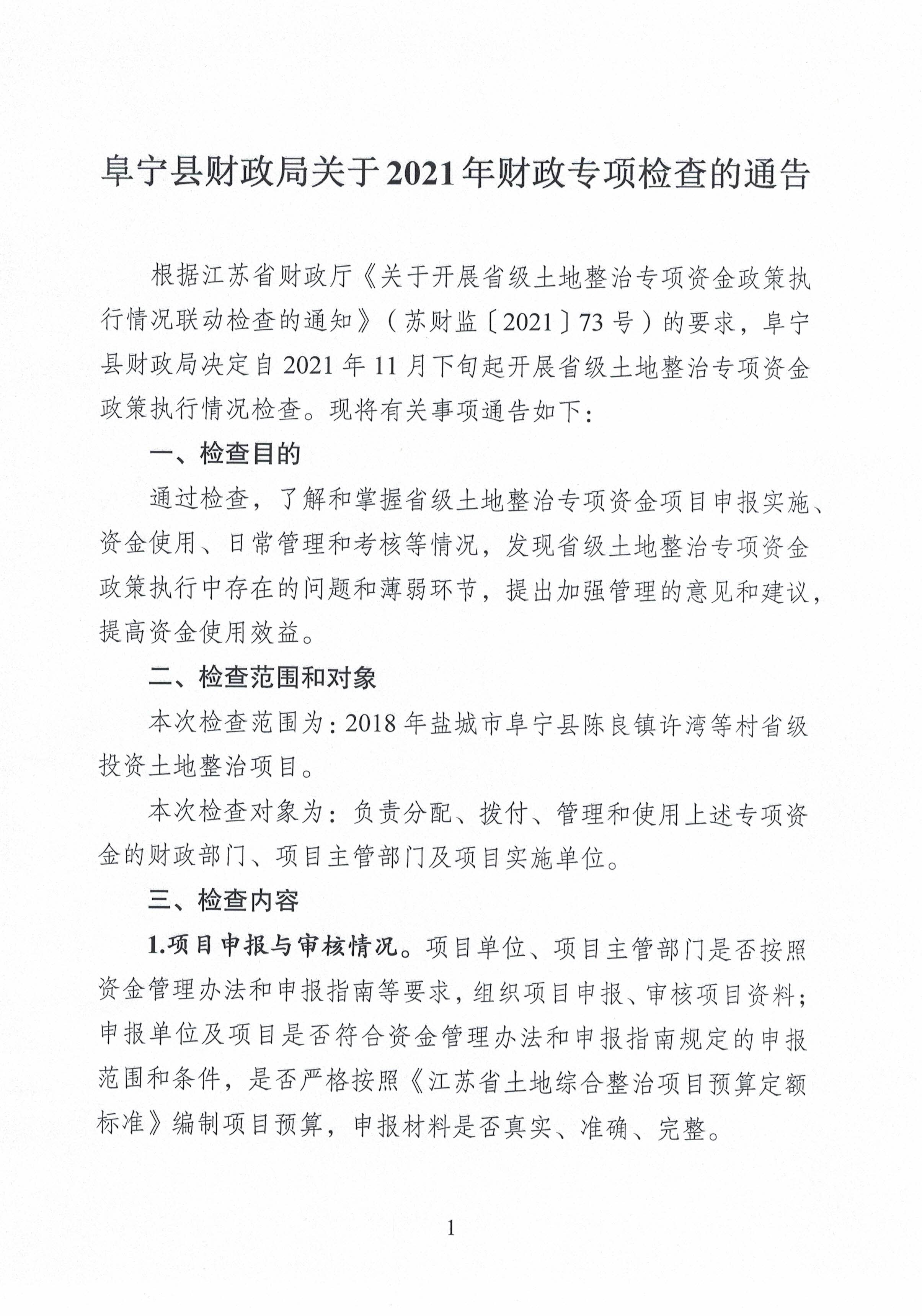 阜宁县财政局关于2021年财政专项检查的通告
