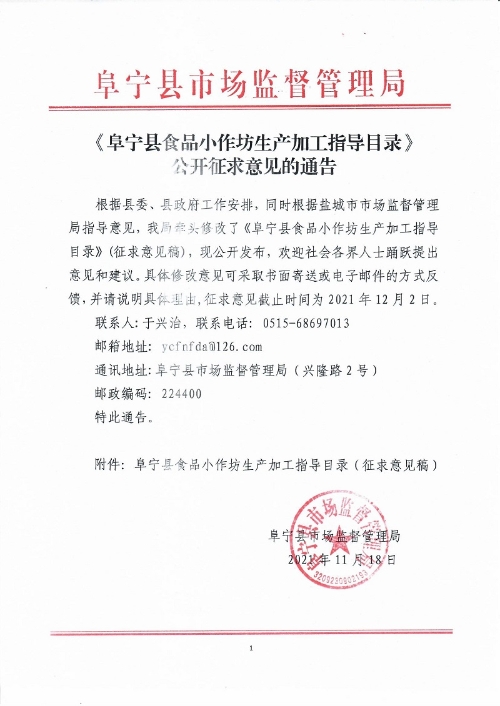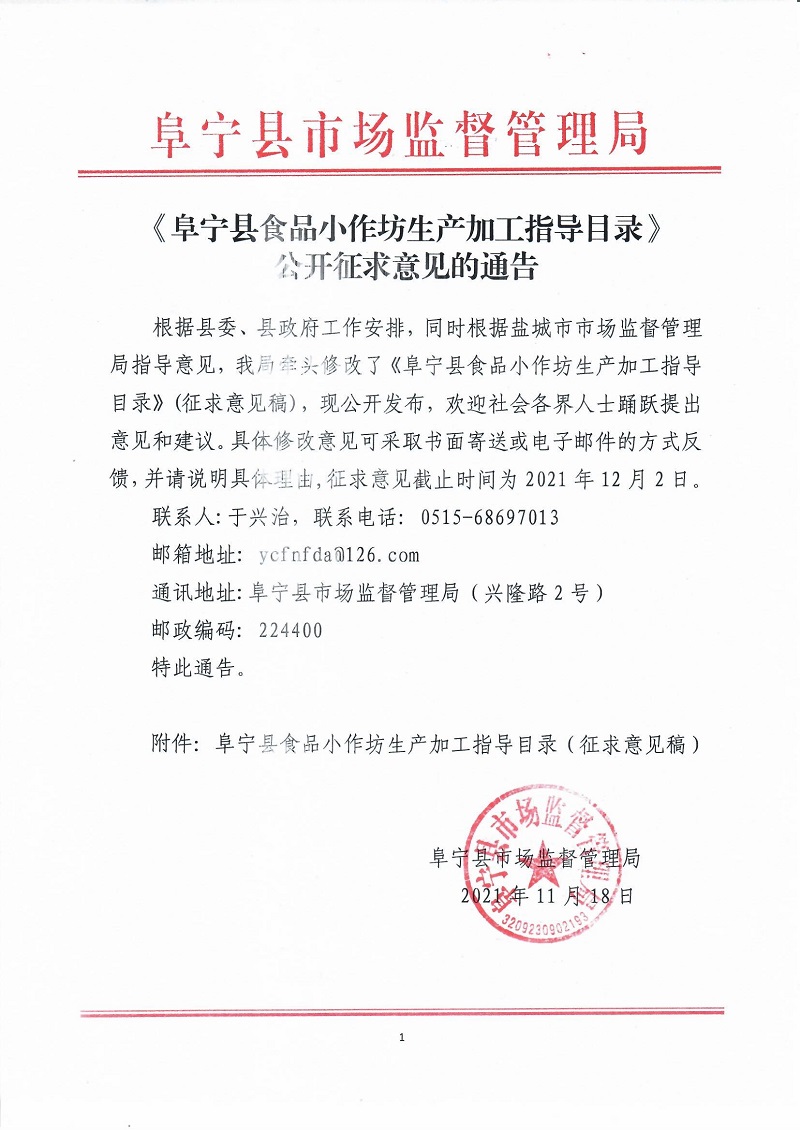 《阜宁县食品小作坊生产加工指导目录》公开征求意见的通告