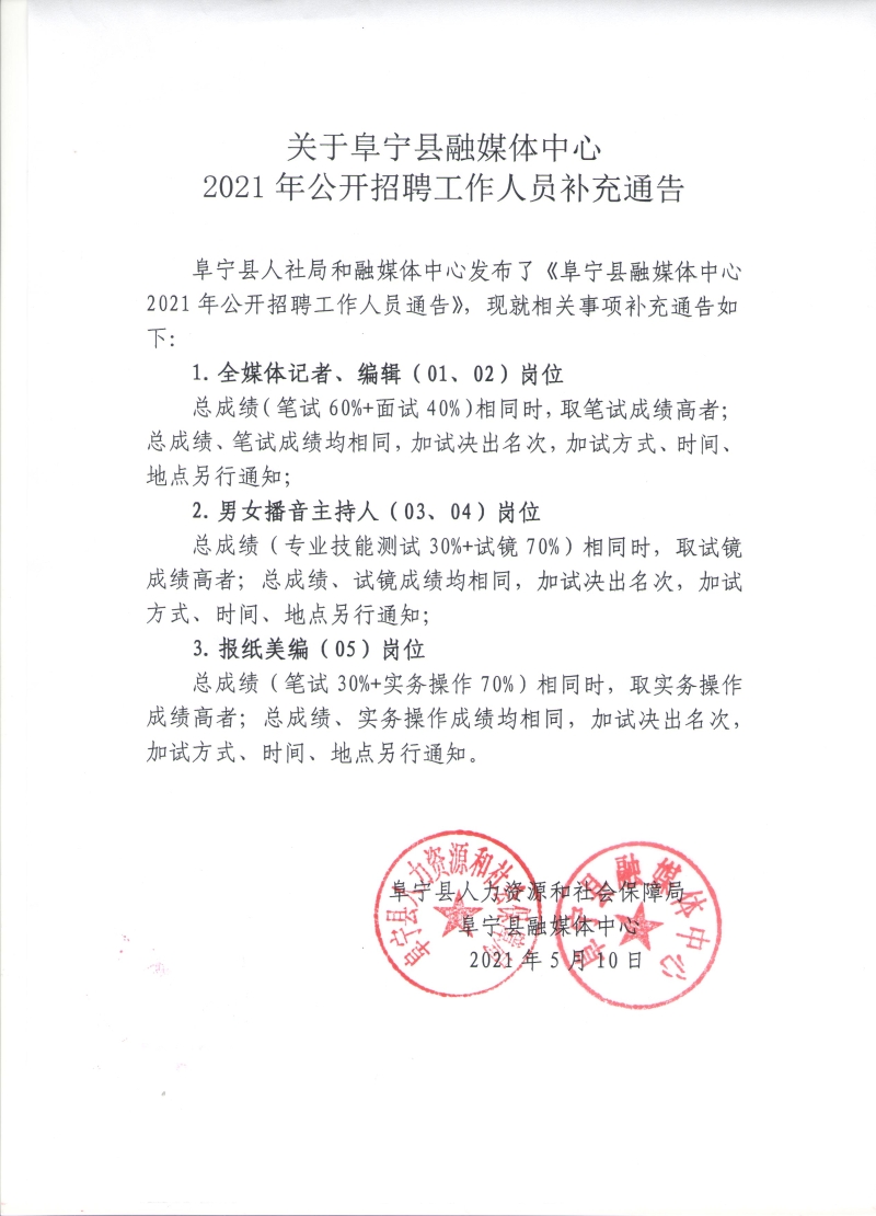 关于阜宁县融媒体中心2021年公开招聘工作人员补充通告