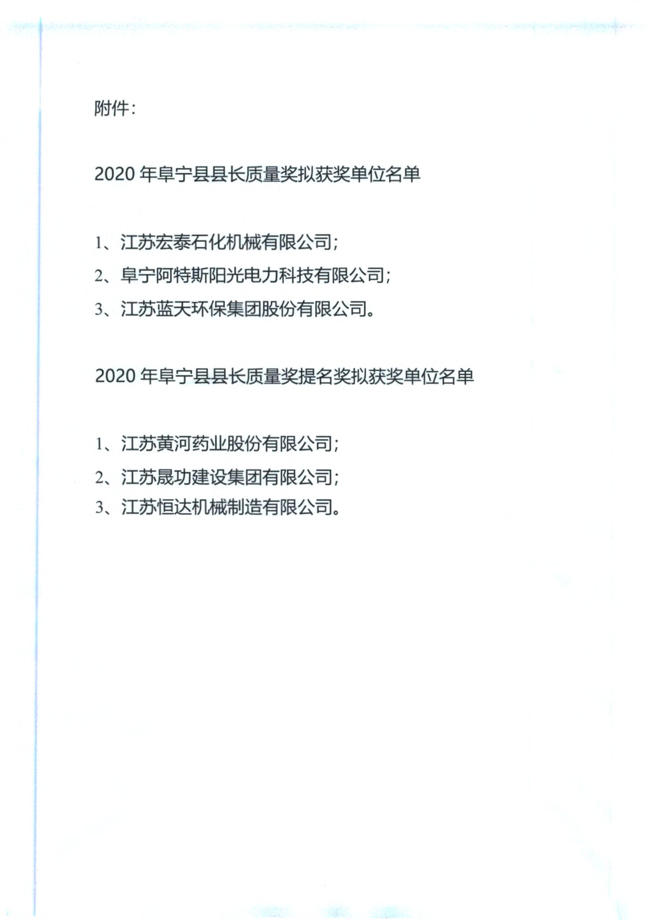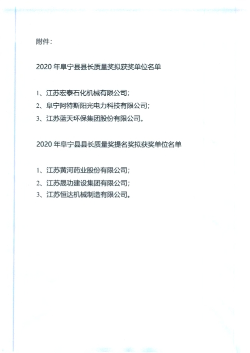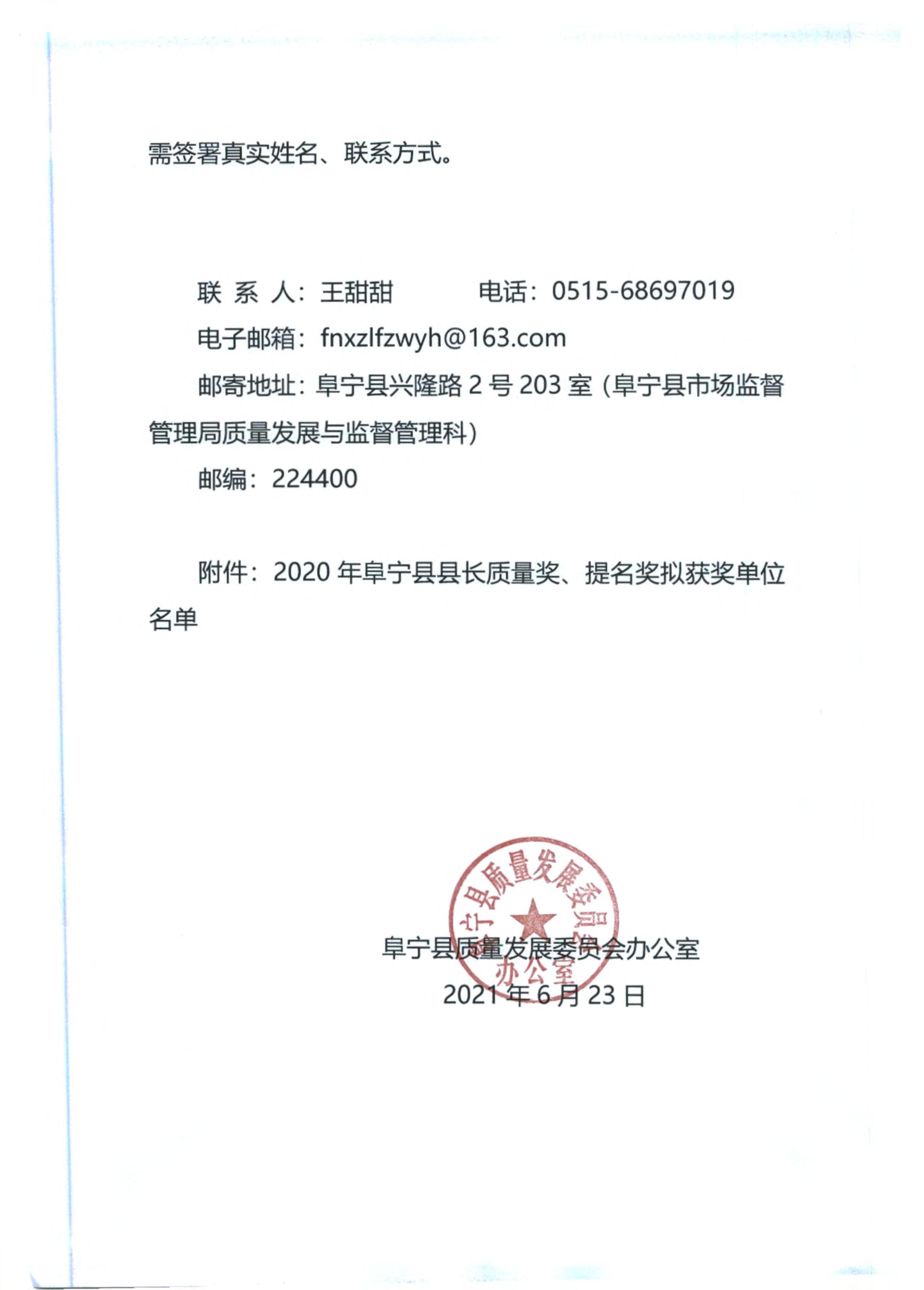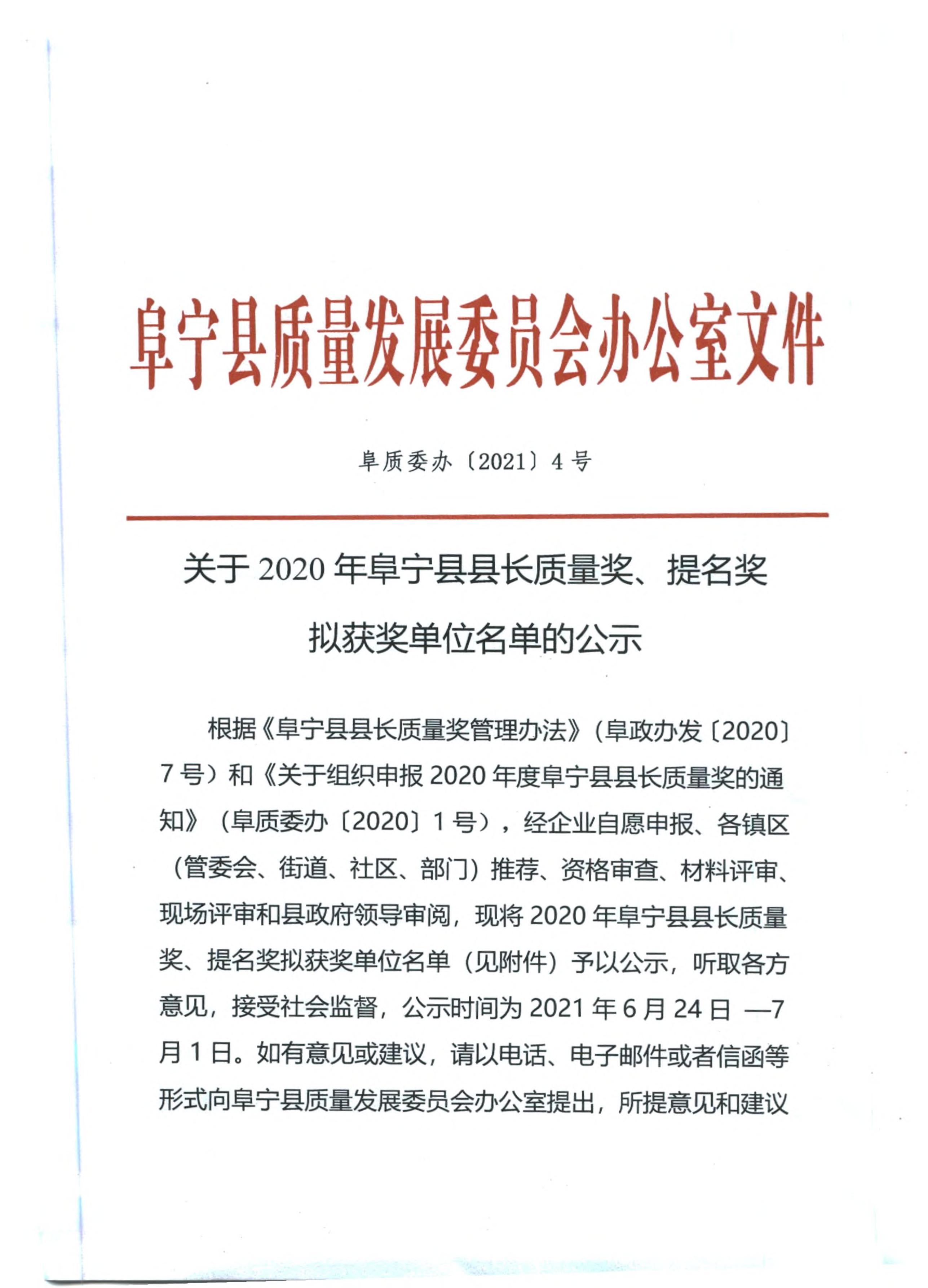 关于2020年阜宁县县长质量奖、提名奖拟获奖单位名单的公示