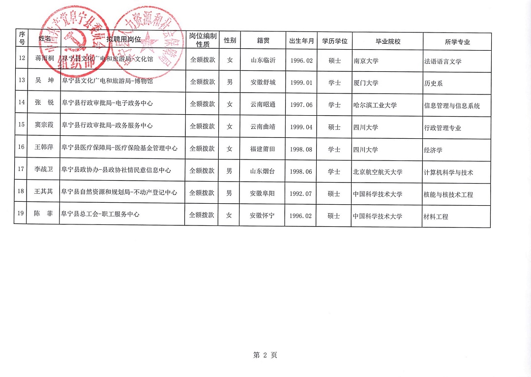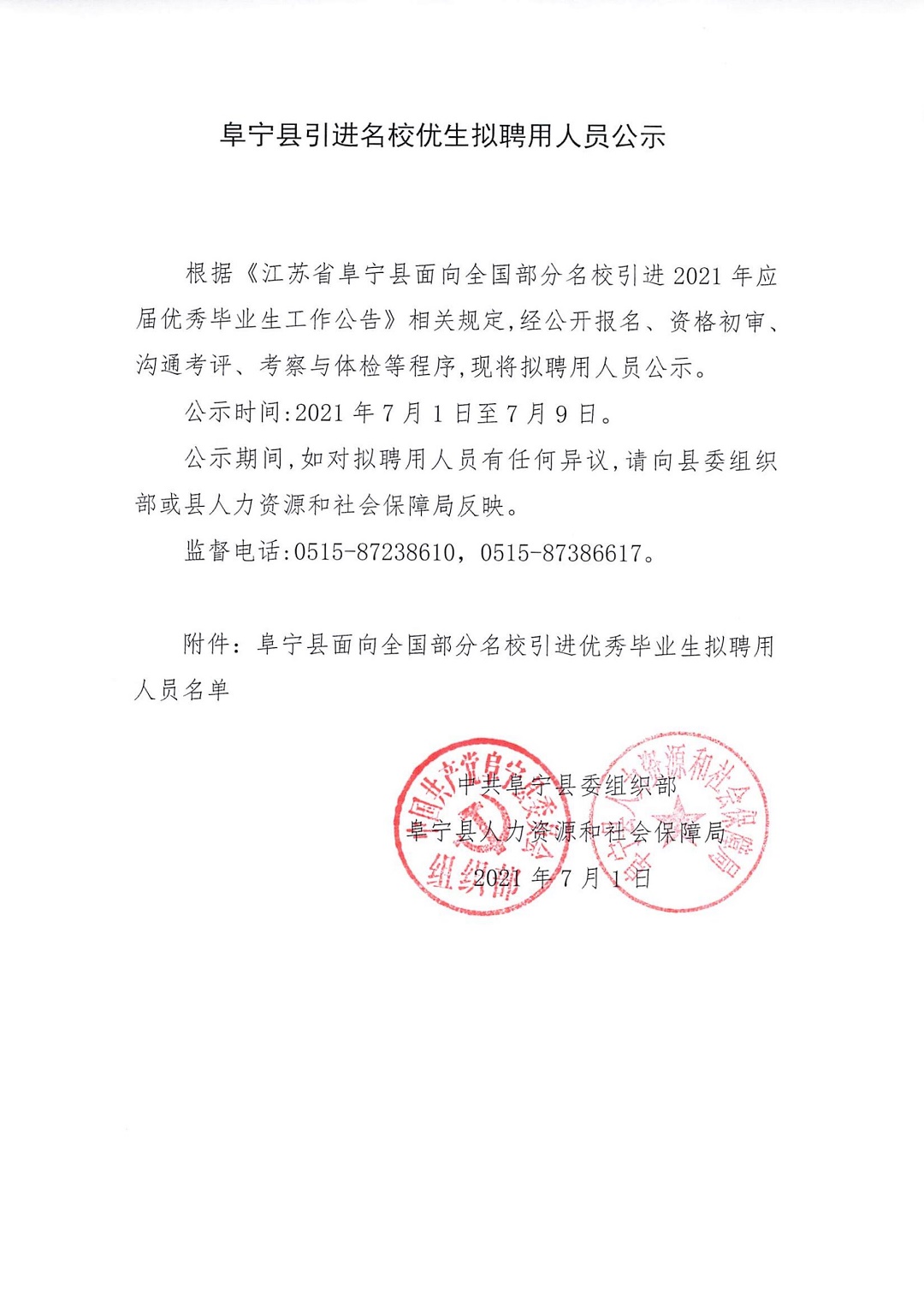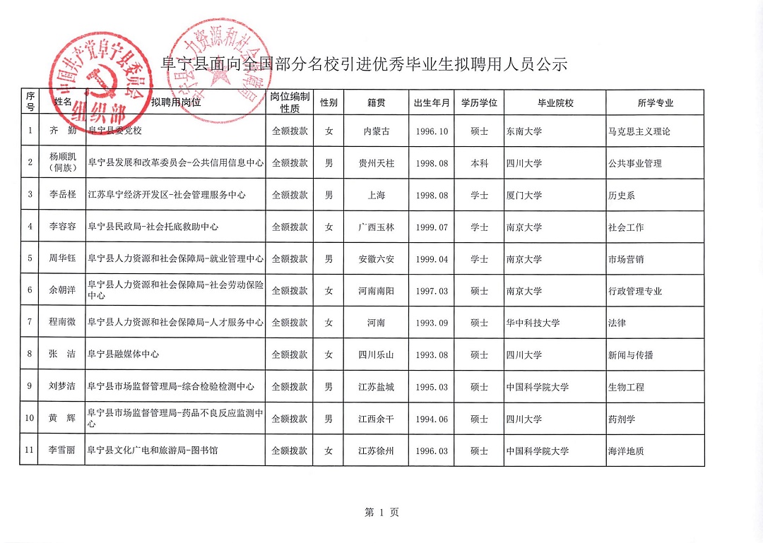阜宁县引进名校优生拟聘用人员公示