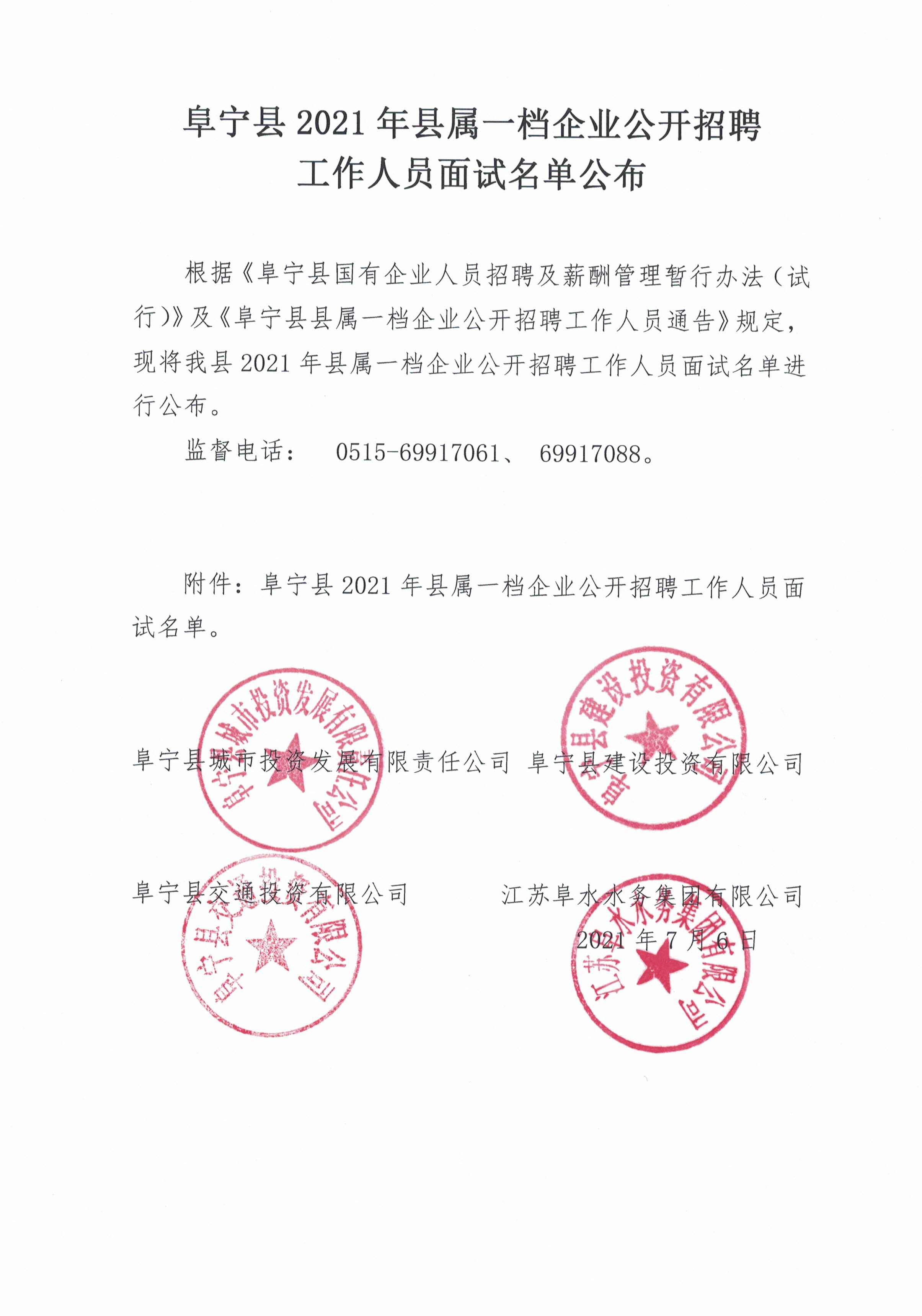 阜宁县2021年县属一档企业公开招聘工作人员面试名单