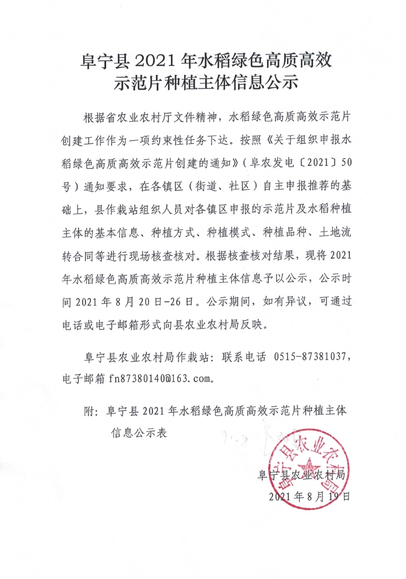 阜宁县2021年水稻绿色高质高效示范片种植主体信息公示