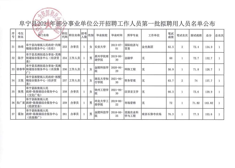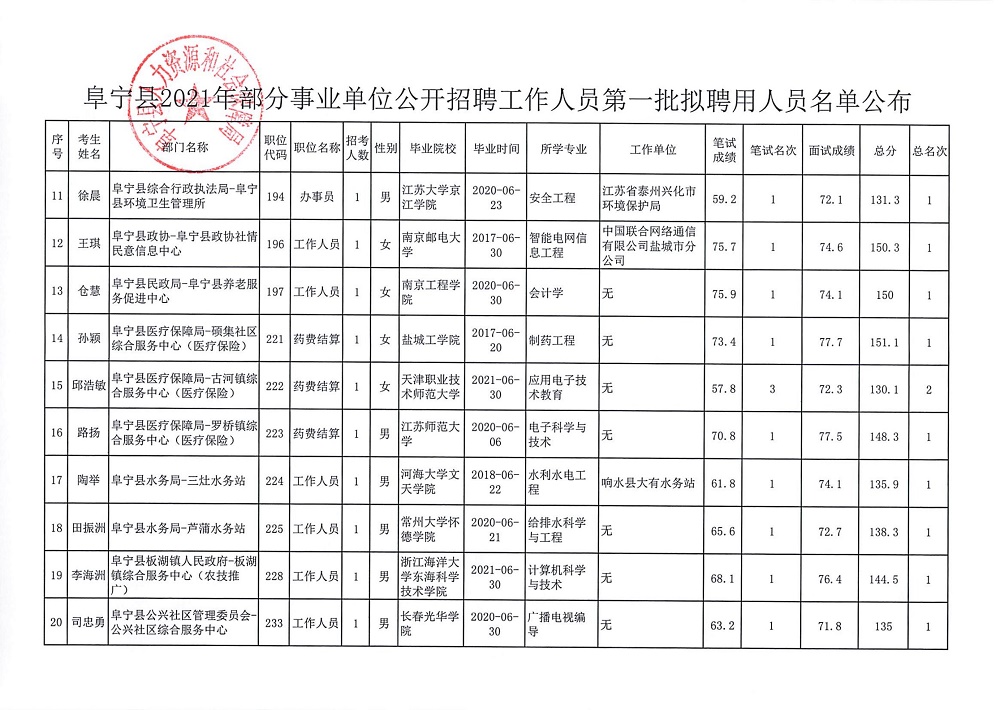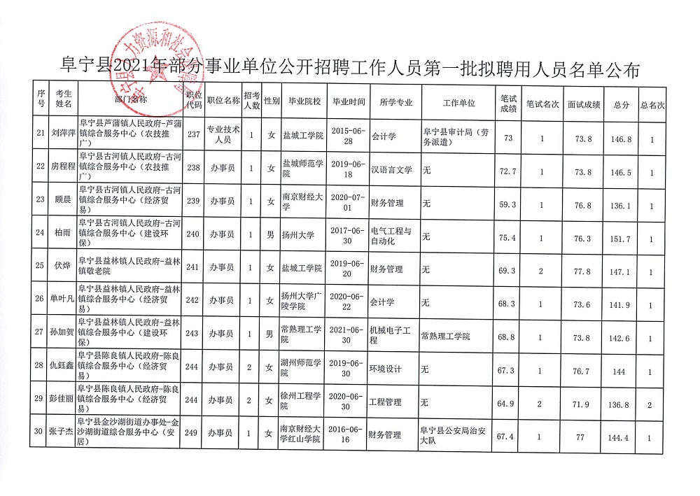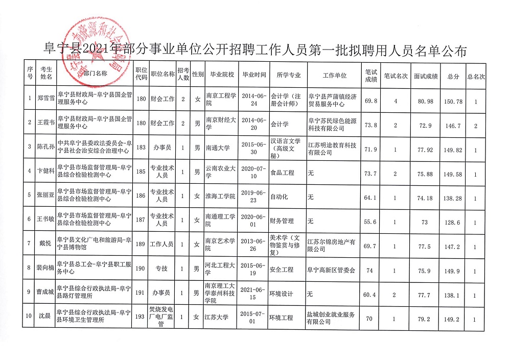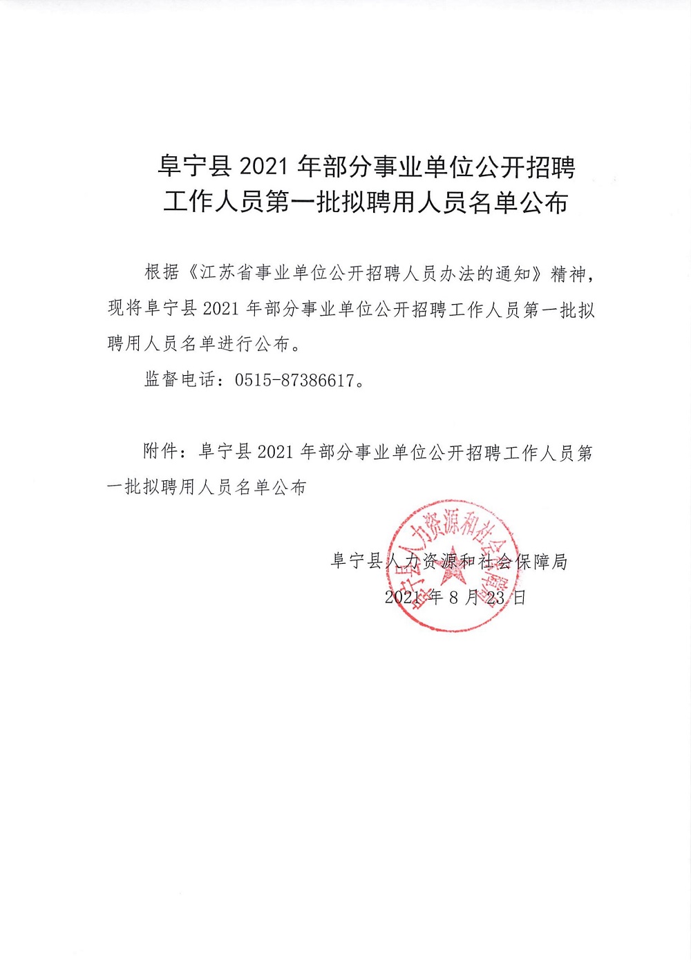 阜宁县2021年部分事业单位公开招聘工作人员第一批拟聘用人员名单公布