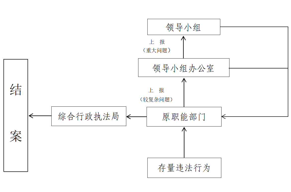 1. 职能划转前存量违法行为处置流程。由原职能部门负责牵头处置结案,县综合行政执法局配合;情况较复杂的,县领导小组办公室牵头会办,确定处置方案,移交原职能部门处置结案;重大问题,报县领导小组研究会办,明确处置要求,由原职能部门处置结案。