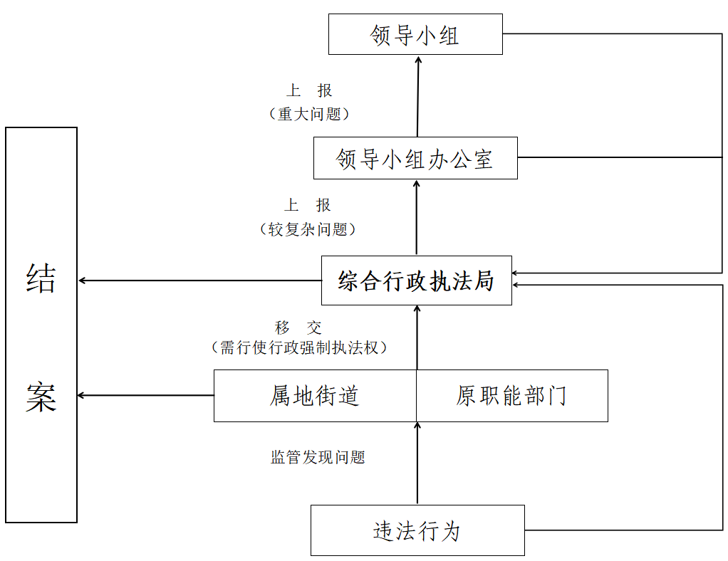 2.职能划转后发生的违法行为处置流程。原职能部门、属地政府、县综合行政执法局都负有监管责任,发现问题及时处置,对苗头性问题、没有产生后果的,及时结案;原职能部门、属地政府对制止效果不明显、需行使行政强制权的,按规定程序报县综合行政执法局立案查处结案;对情况复杂、影响较大的,同时报县领导小组或领导小组办公室会办。