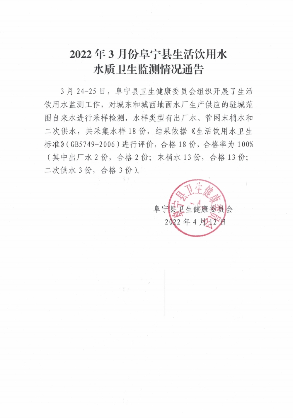 2022年3月份阜宁县生活饮用水水质卫生监测情况通告