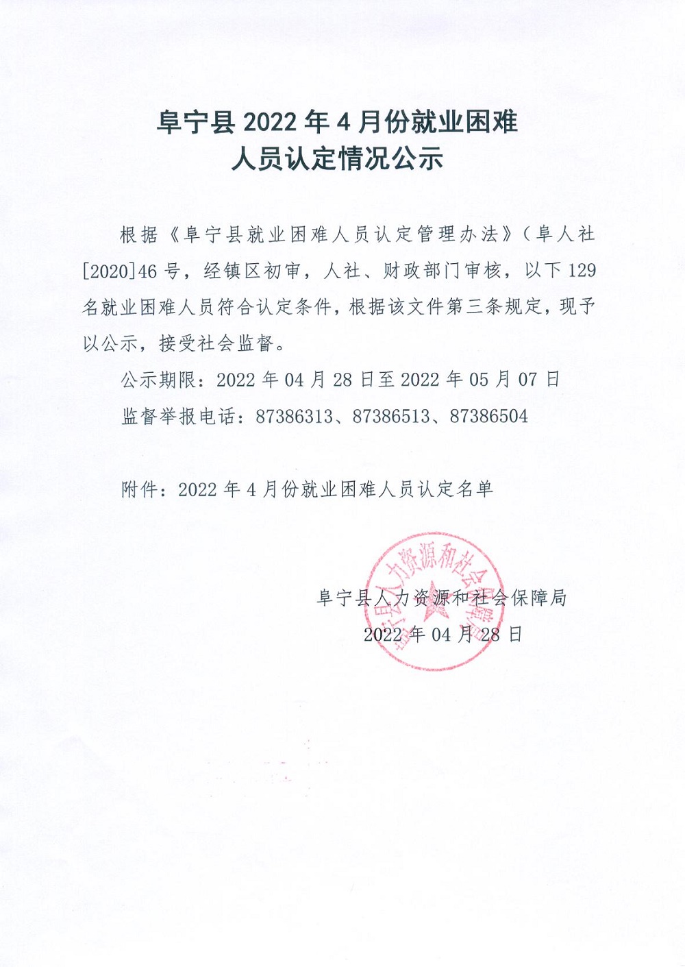 阜宁县2022年4月份就业困难人员认定情况公示
