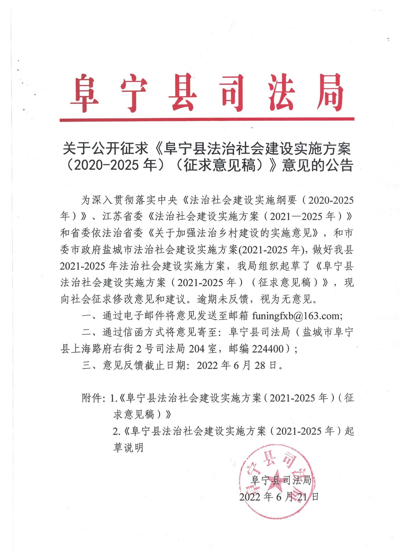 关于公开征求《阜宁县法治社会建设实施方案(2020-2025年)(征求意见稿)》意见的公告