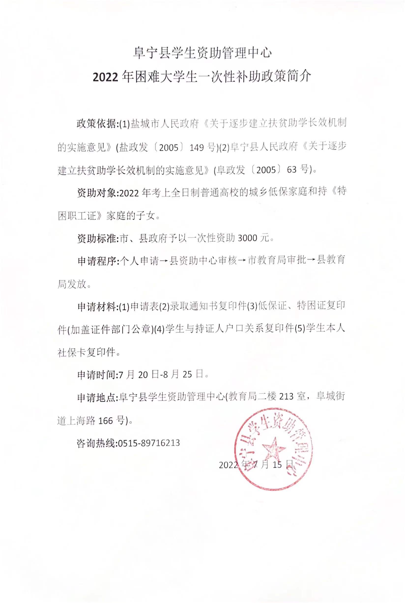 阜宁县学生资助管理中心2022年困难大学生一次性补助政策简介