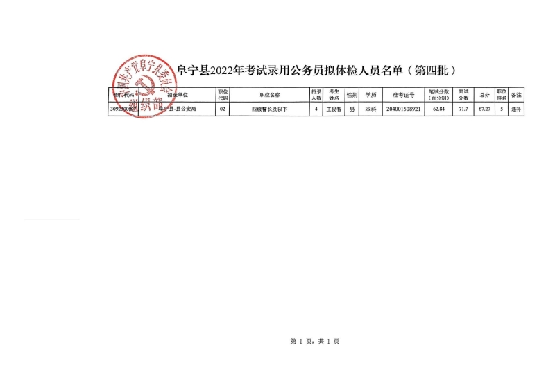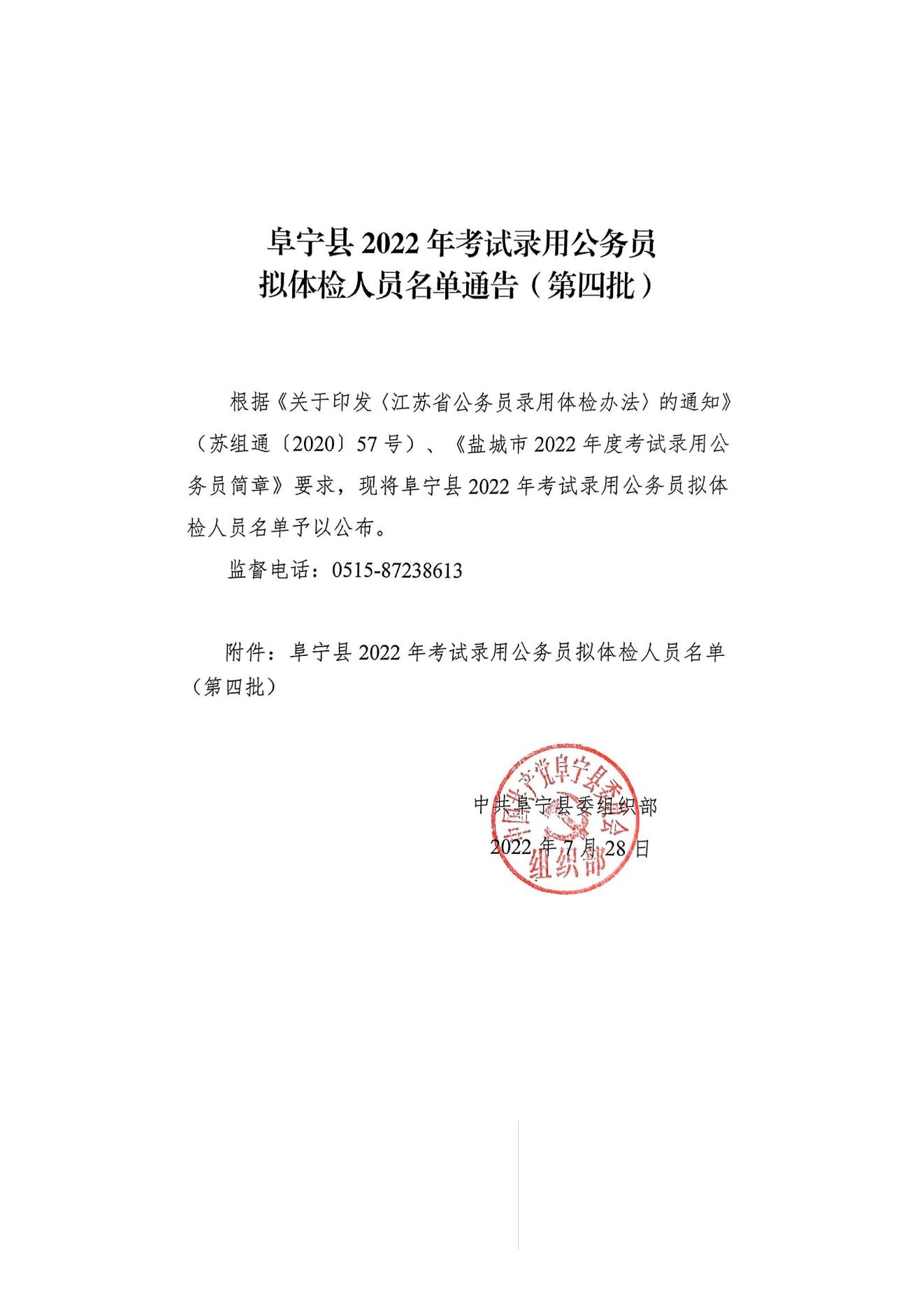 阜宁县2022年考试录用公务员拟体检人员名单通告(第四批)