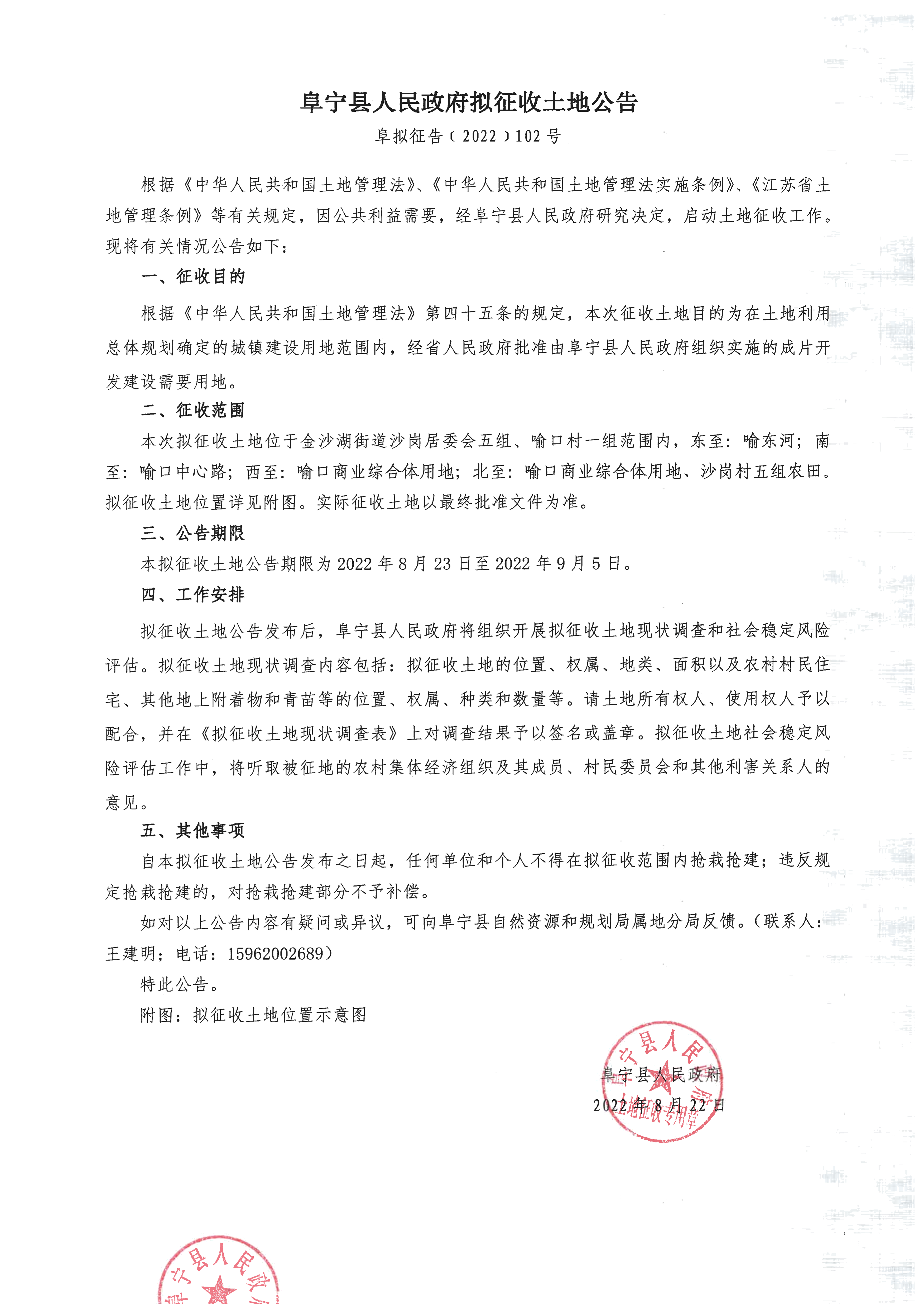 阜宁县人民政府拟征收土地公告