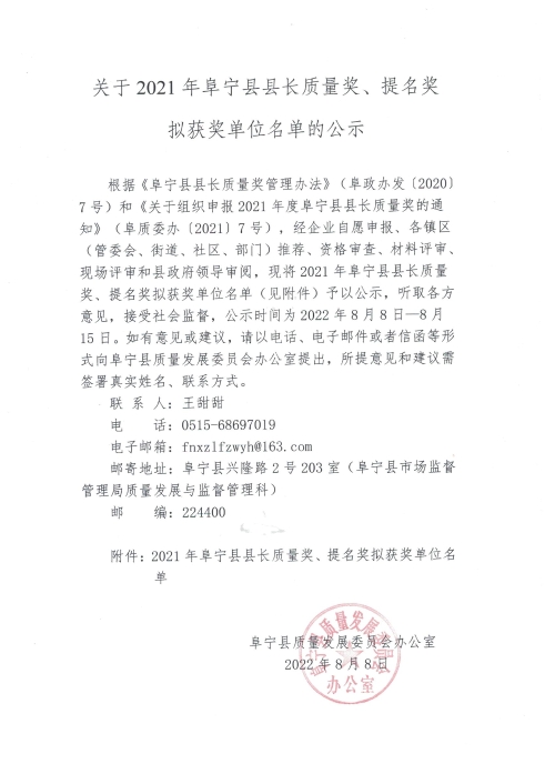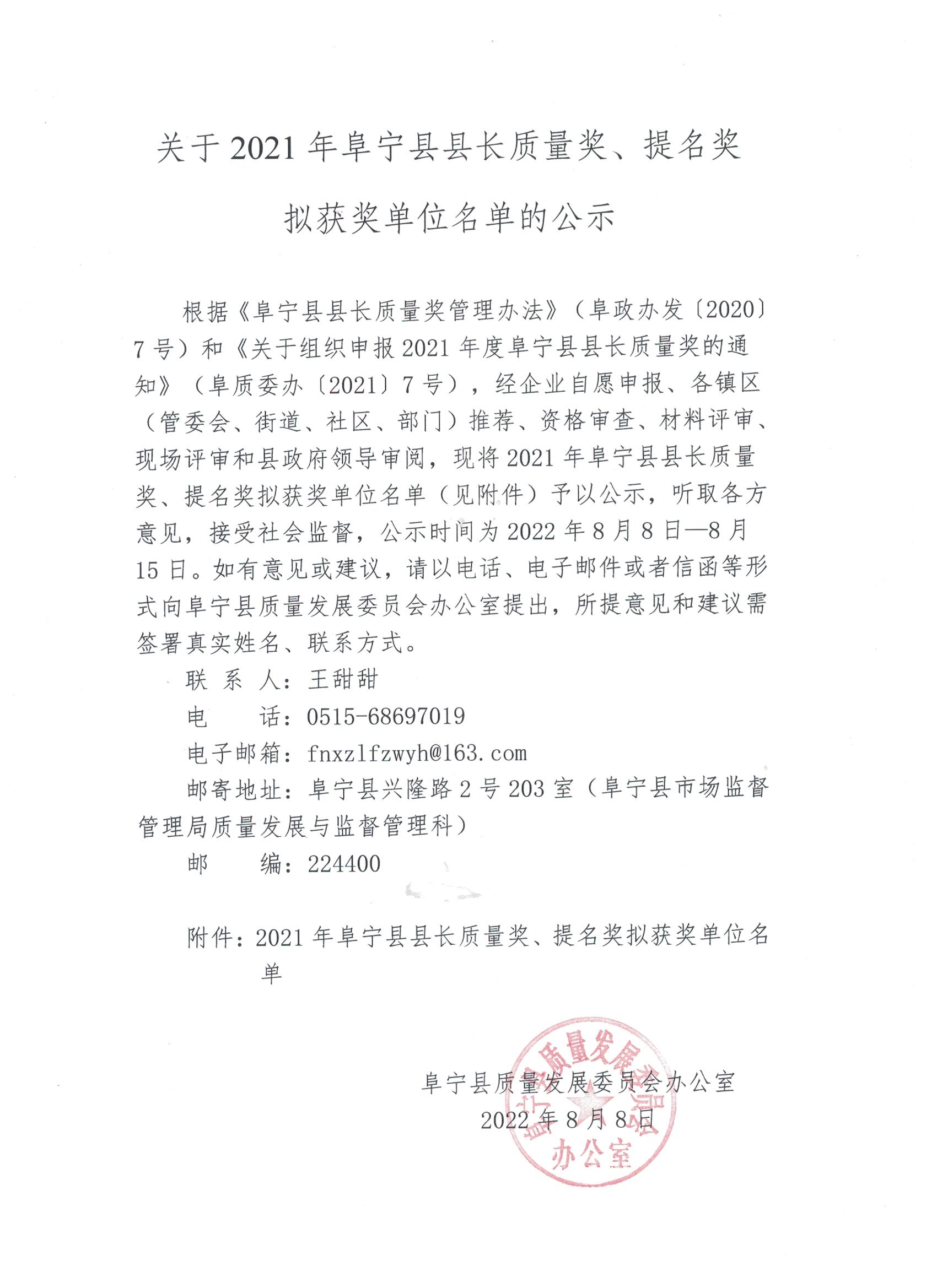 关于2021年阜宁县县长质量奖、提名奖拟获奖单位名单的公示