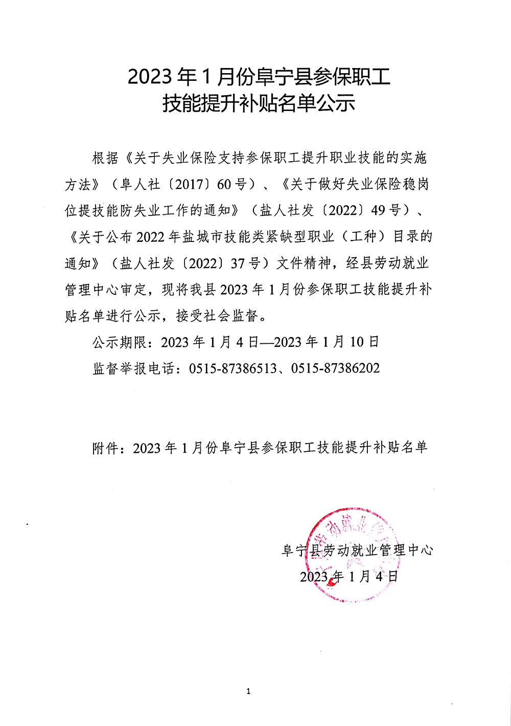 2023年1月份阜宁县参保职工技能提升补贴名单公示