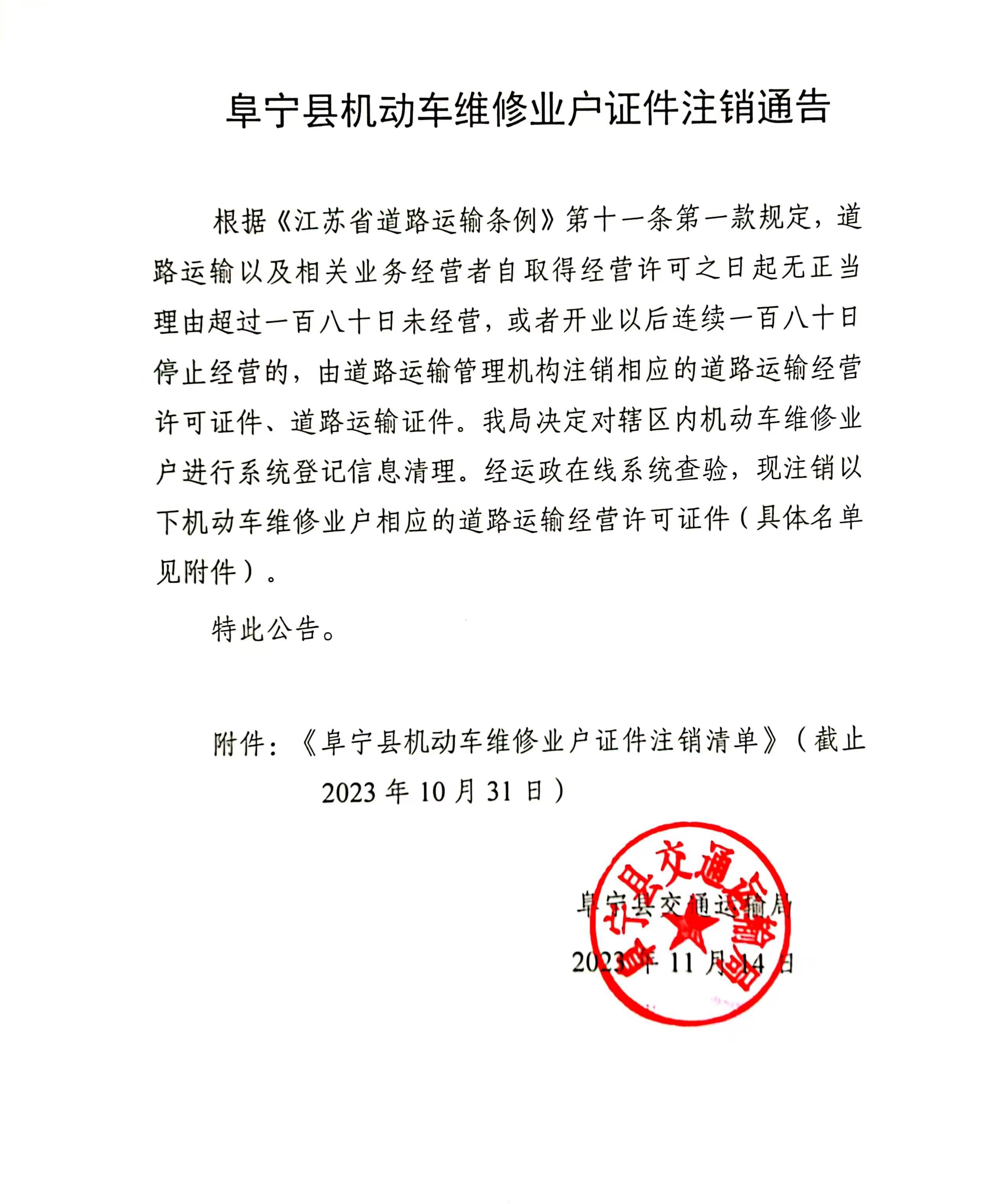 阜宁县机动车维修业户证件注销通告