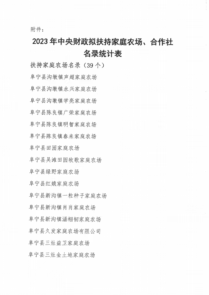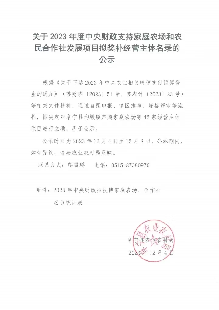 关于2023年度中央财政支持家庭农场和农民合作社发展项目拟奖补经营主体名录的公示