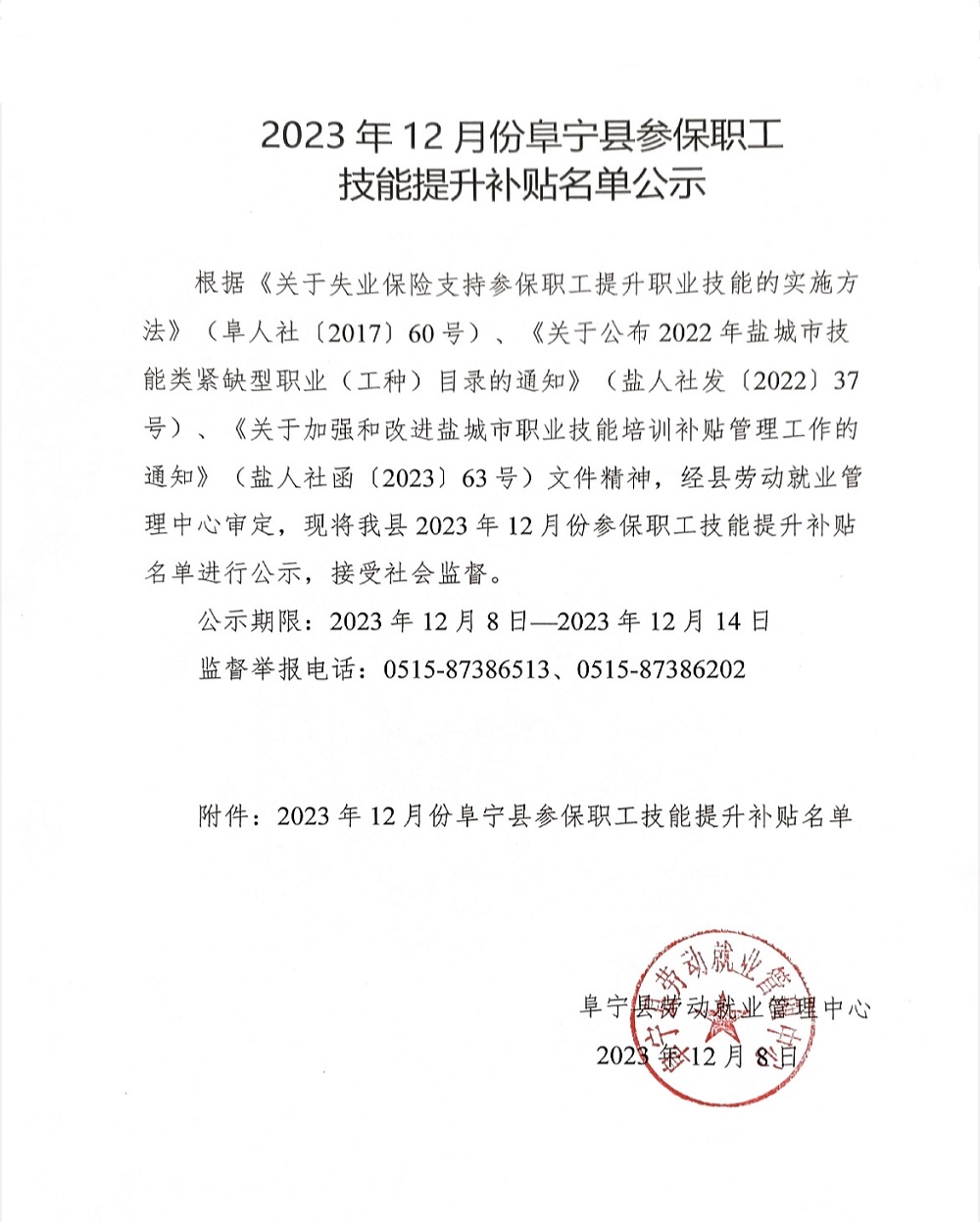 2023年12月份阜宁县参保职工技能提升补贴名单公示