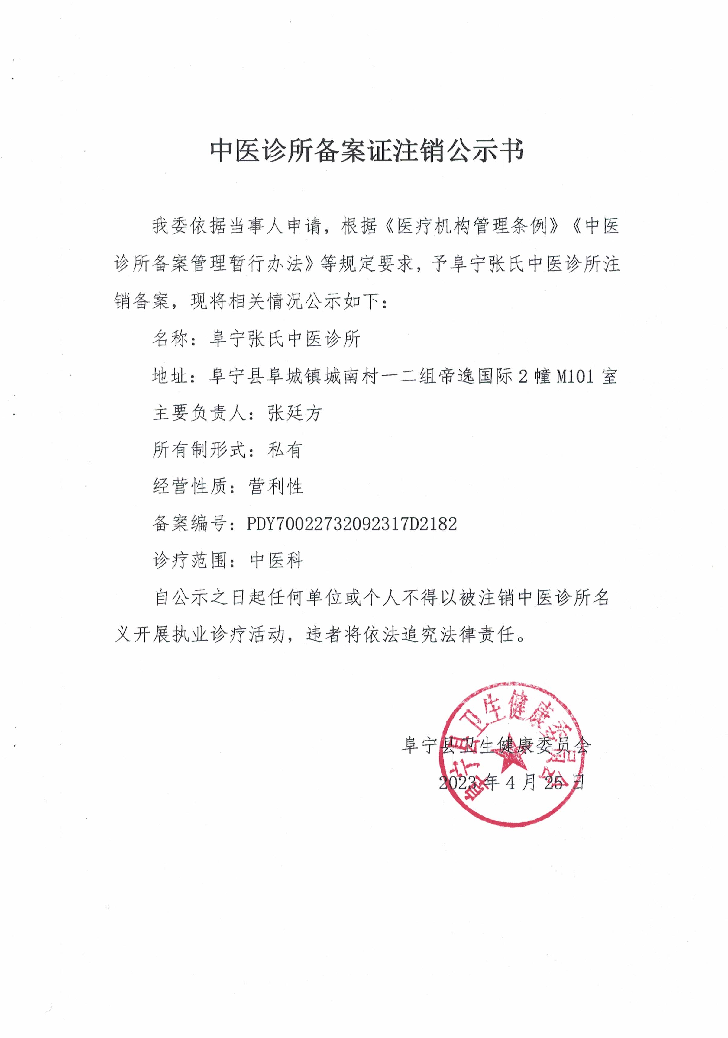 中医诊所备案证注销公示书