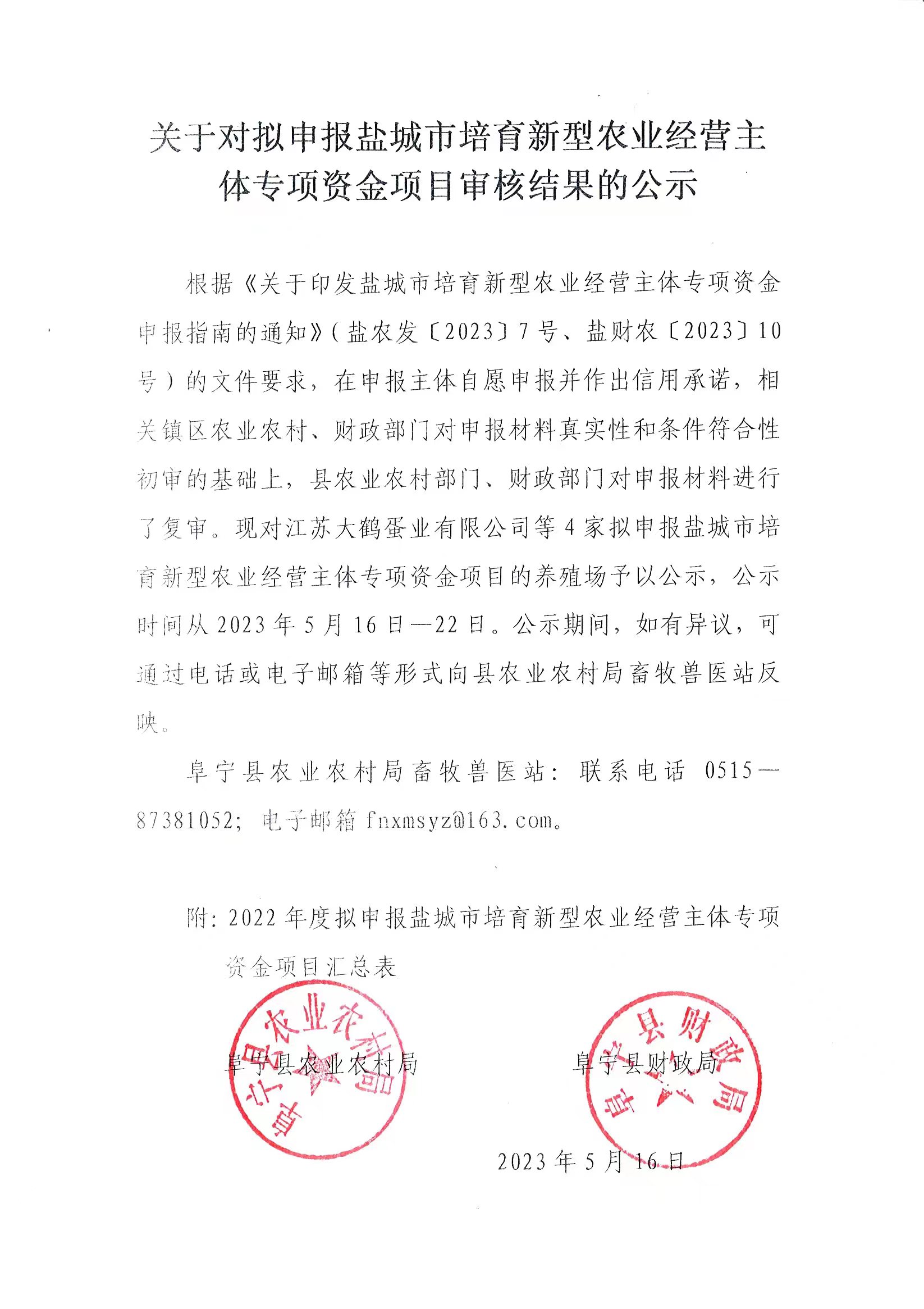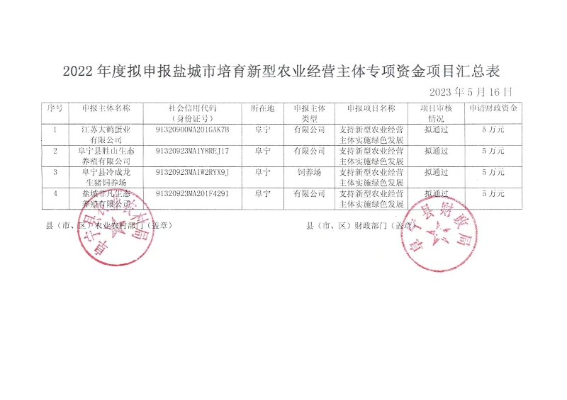 关于对申报盐城市培育新型农业经营主体专项资金项目审核结果的公示