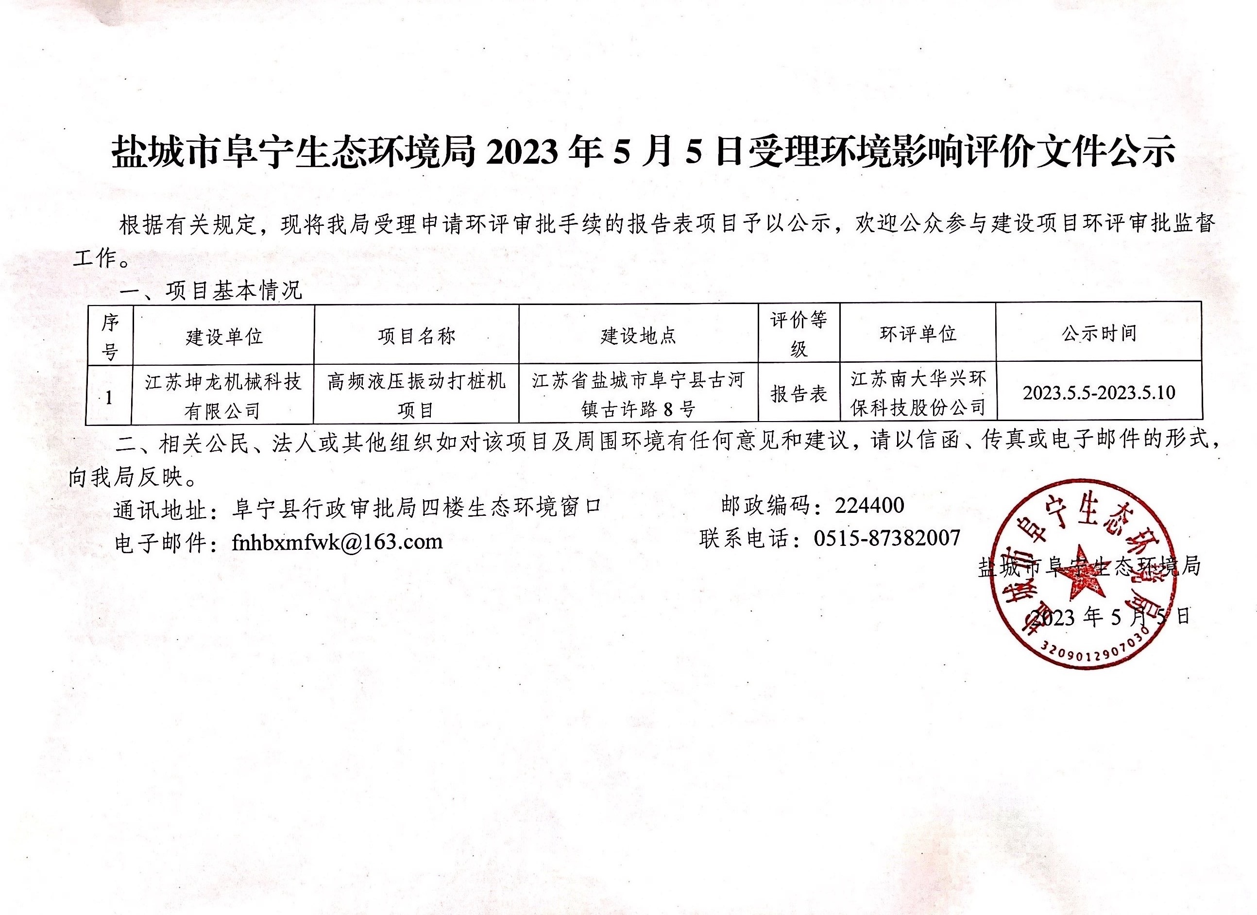 盐城市阜宁生态环境局2023年5月5日受理环境影响评价文件公示