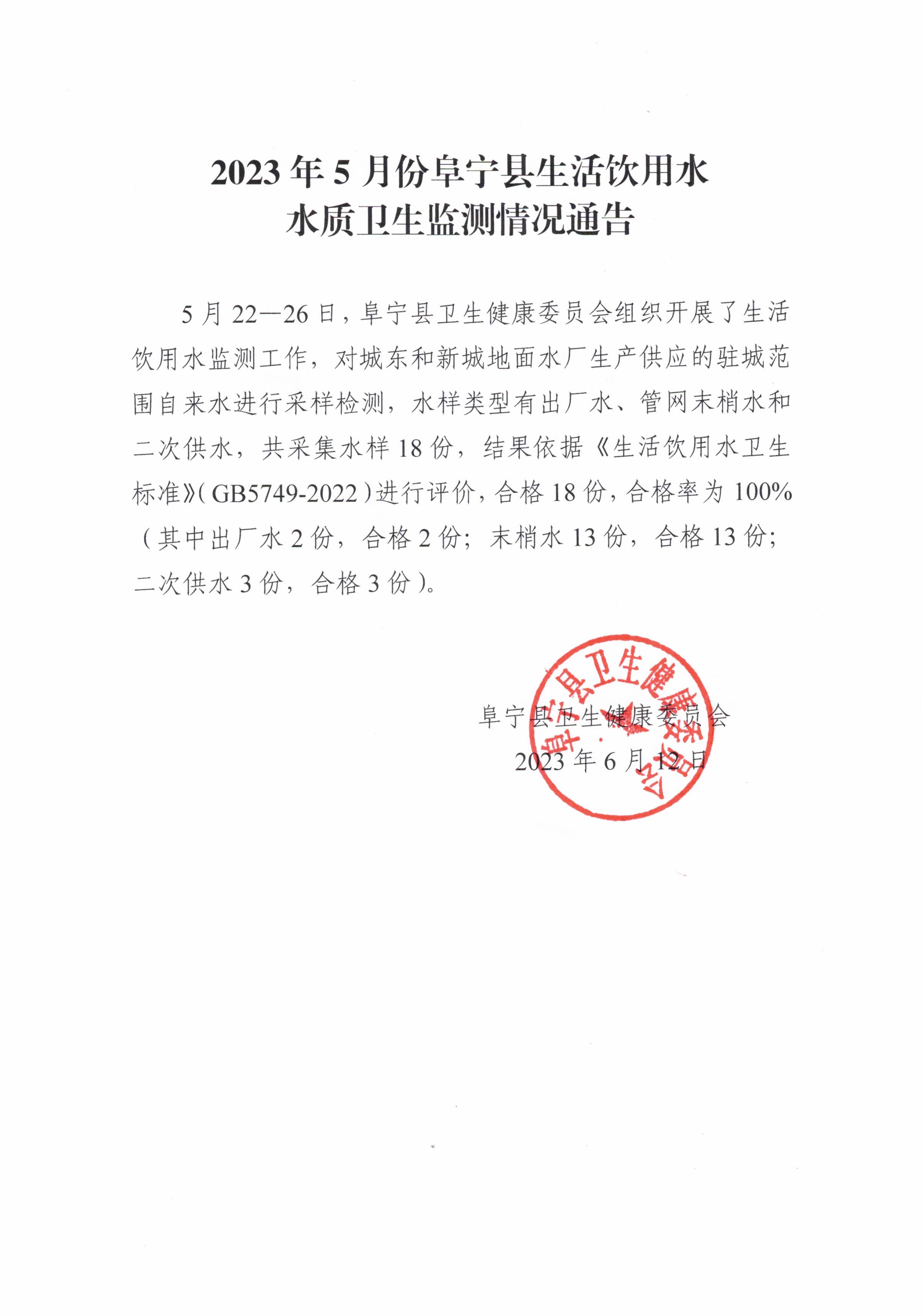 2023年5月份阜宁县生活饮用水水质卫生监测情况通告