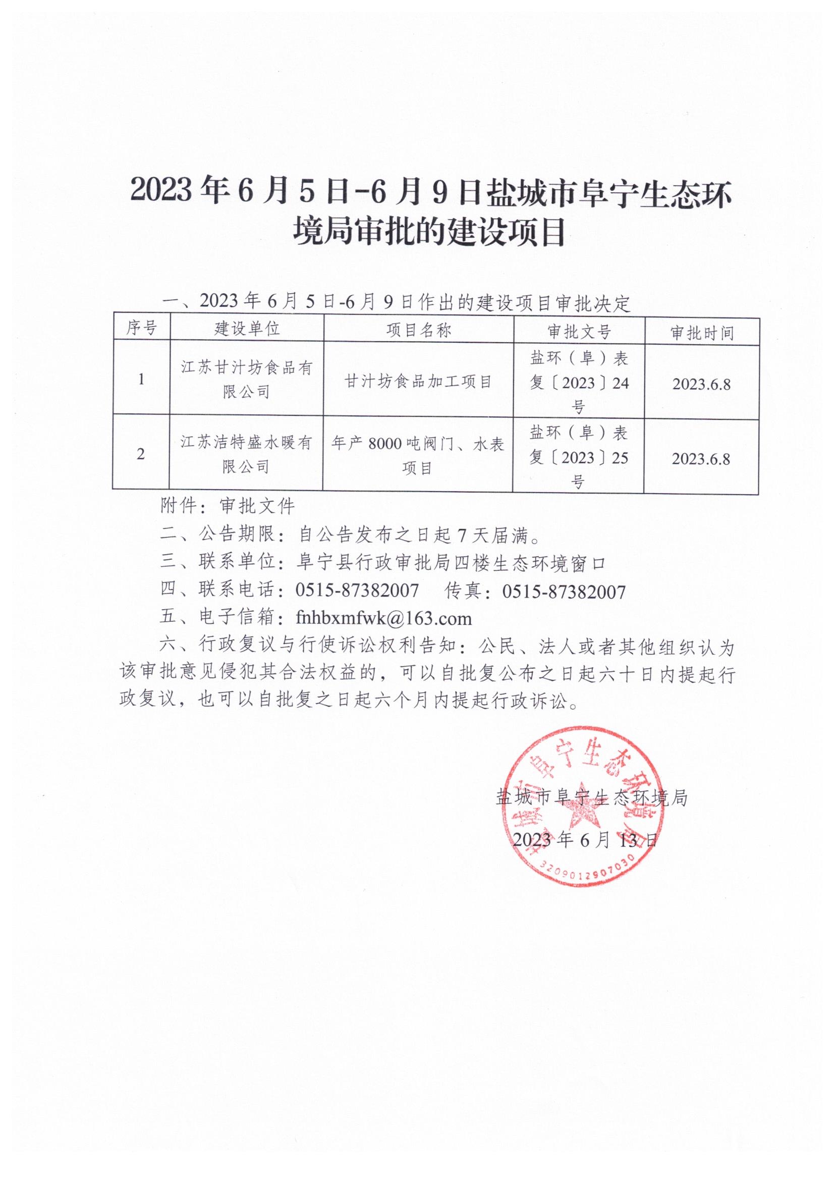 2023年6月5日-6月9日盐城市阜宁生态环境局审批的建设项目