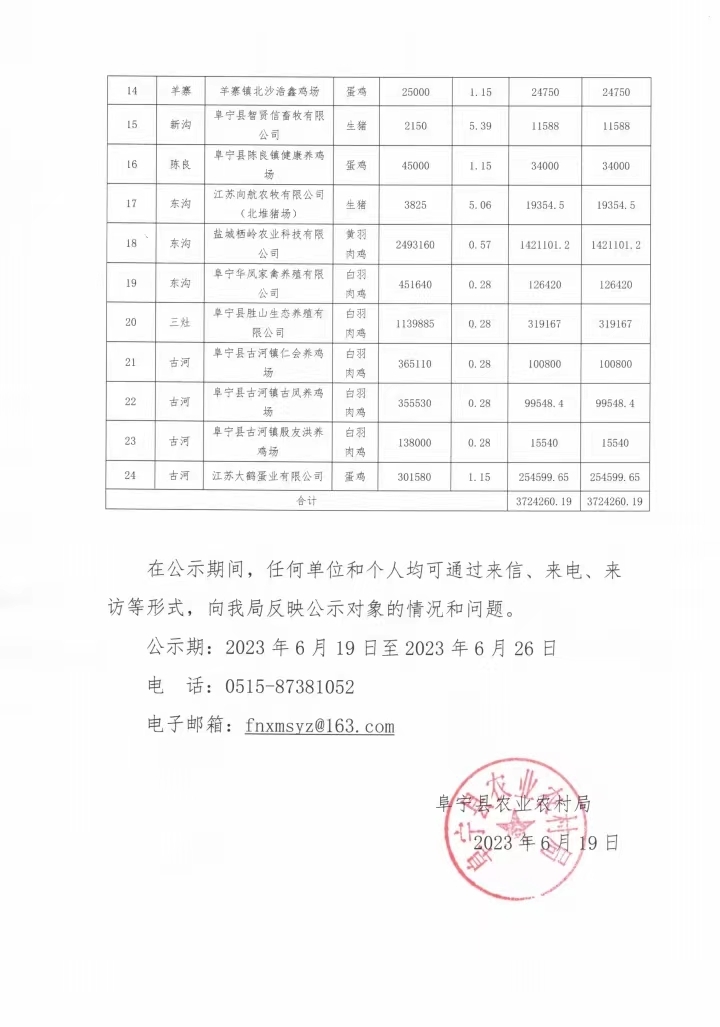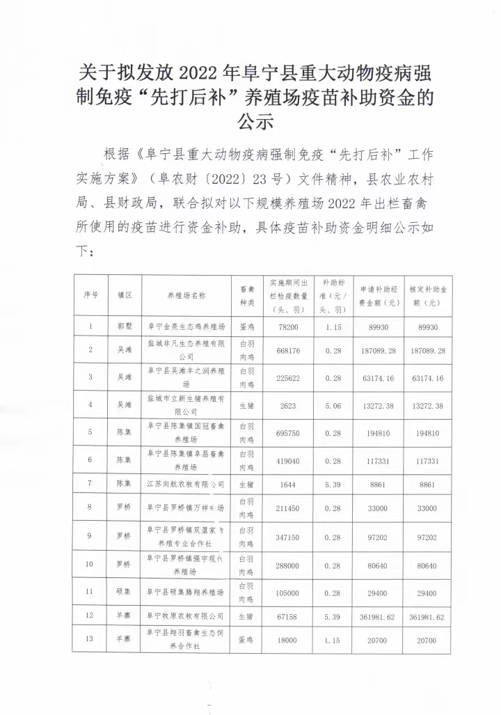 关于拟发放2022年阜宁县重大动物疫病强制免疫“先打后补”养殖场疫苗补助资金的公示