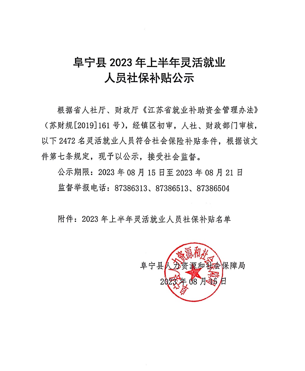 阜宁县2023年上半年灵活就业人员社保补贴公示