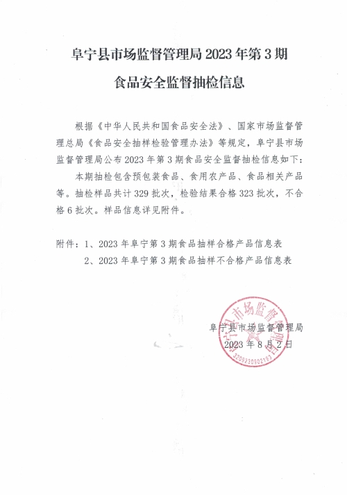 阜宁县市场监督管理局2023年第3期食品安全监督抽检信息