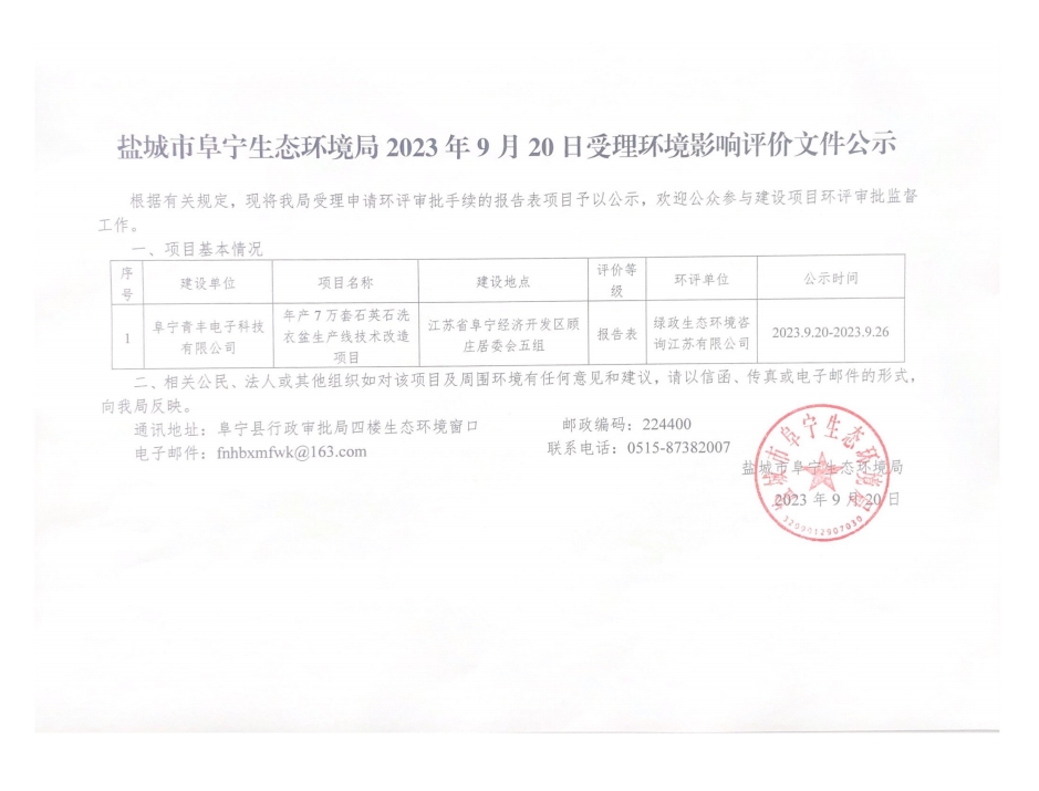 盐城市阜宁生态环境局2023年9月20日受理环境影响评价文件公示