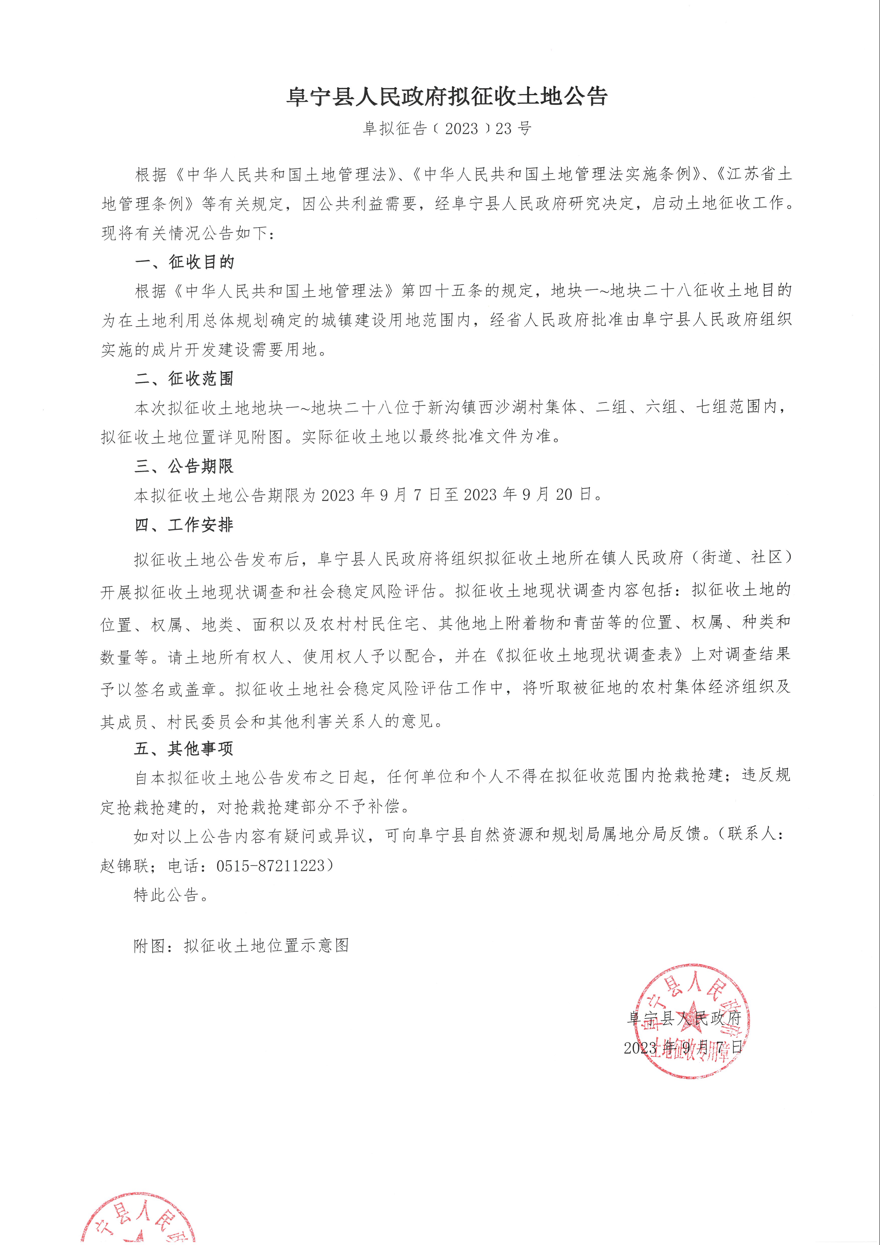 阜宁县人民政府拟征收土地公告