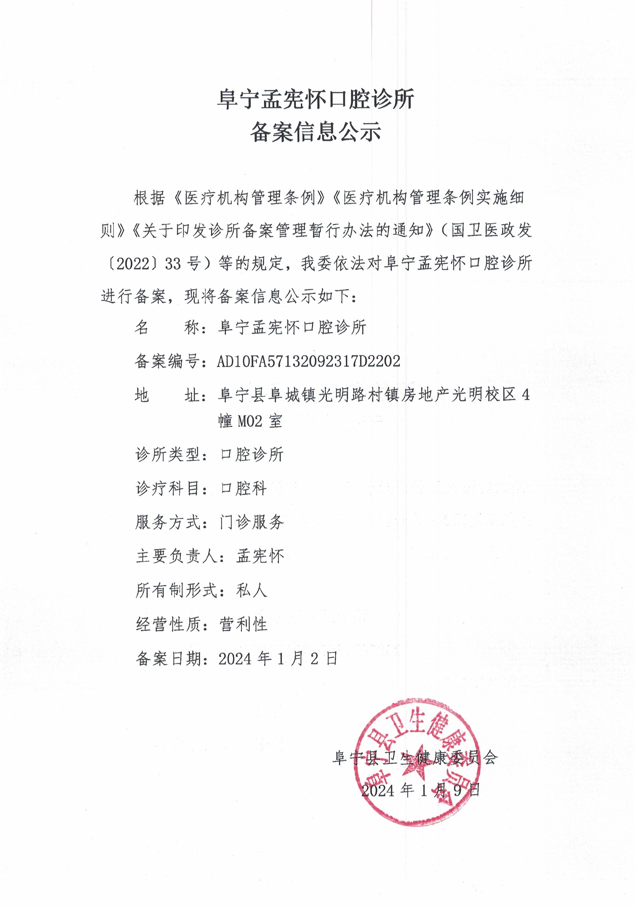 阜宁孟宪怀口腔诊所备案信息公示