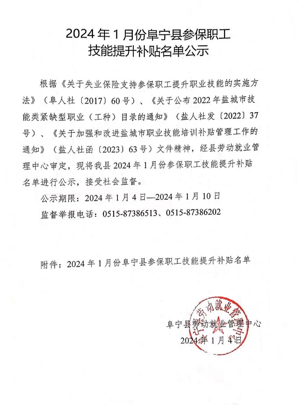 2024年1月份阜宁县参保职工技能提升补贴名单公示