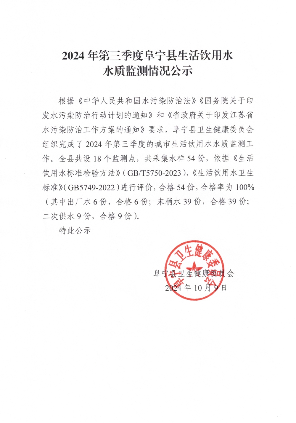 2024年第三季度阜宁县生活饮用水水质监测情况公示