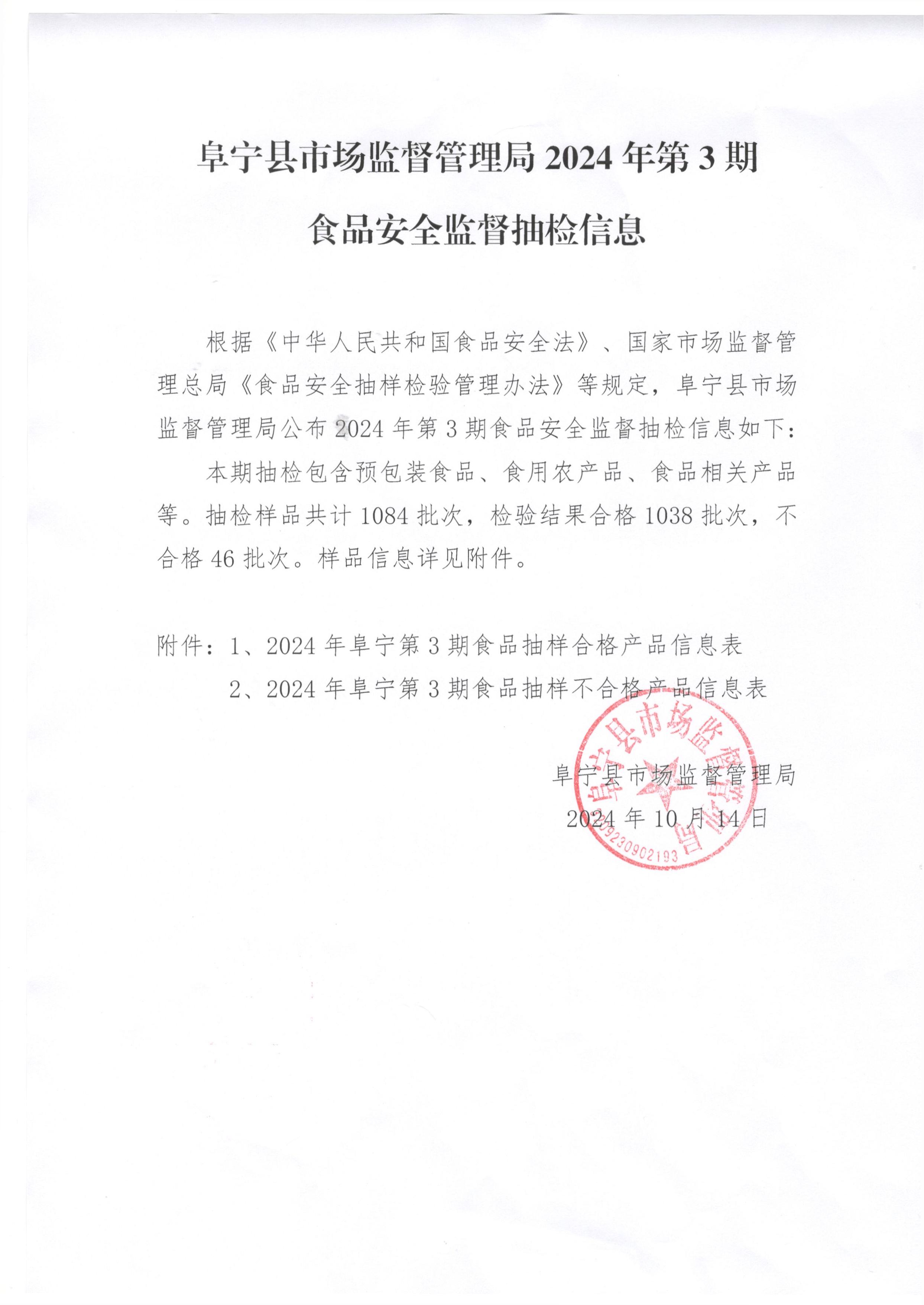 阜宁县市场监督管理局2024年第3期食品安全监督抽检信息