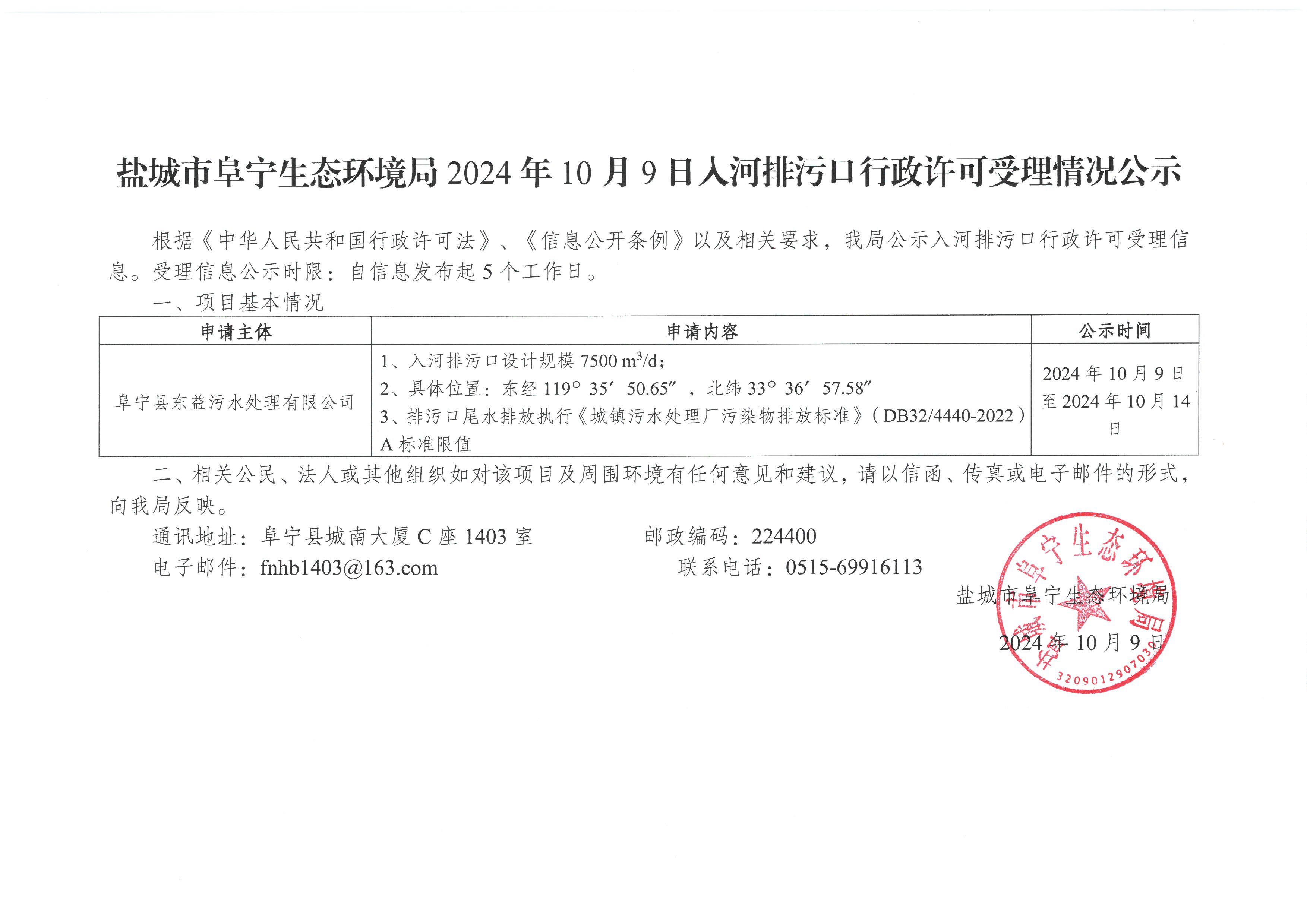 盐城市阜宁生态环境局2024年10月9日入河排污口行政许可受理情况公示