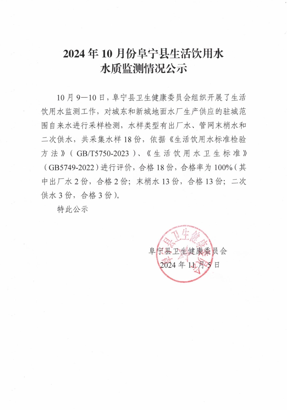 2024年10月份阜宁县生活饮用水水质监测情况公示