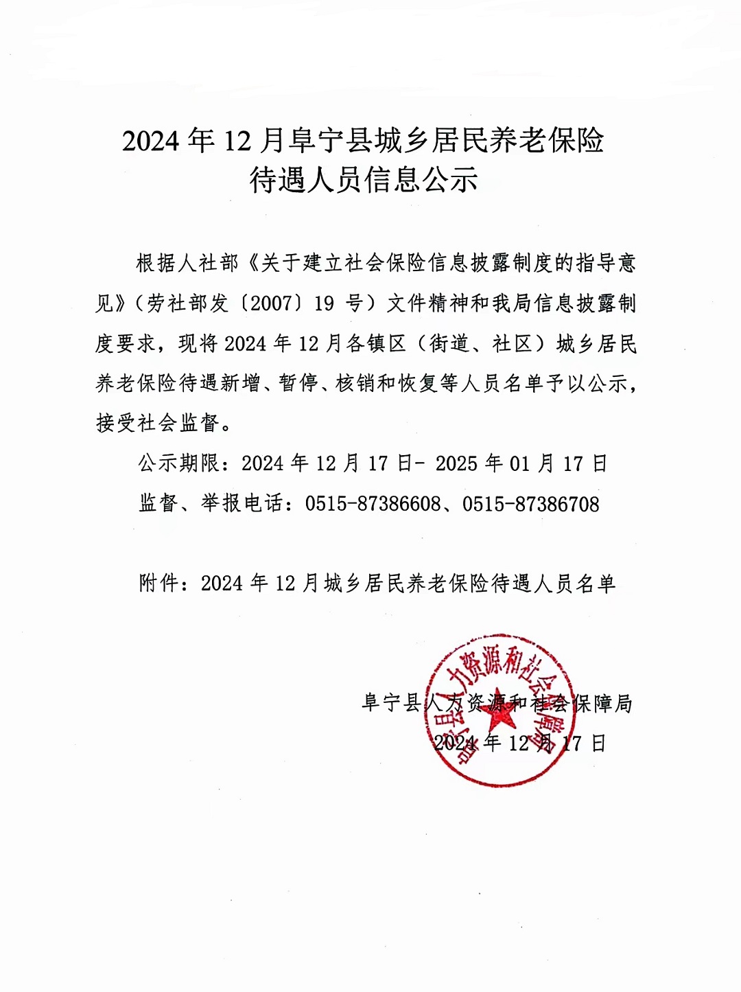 2024年12月阜宁县城乡居民养老保险待遇人员信息公示