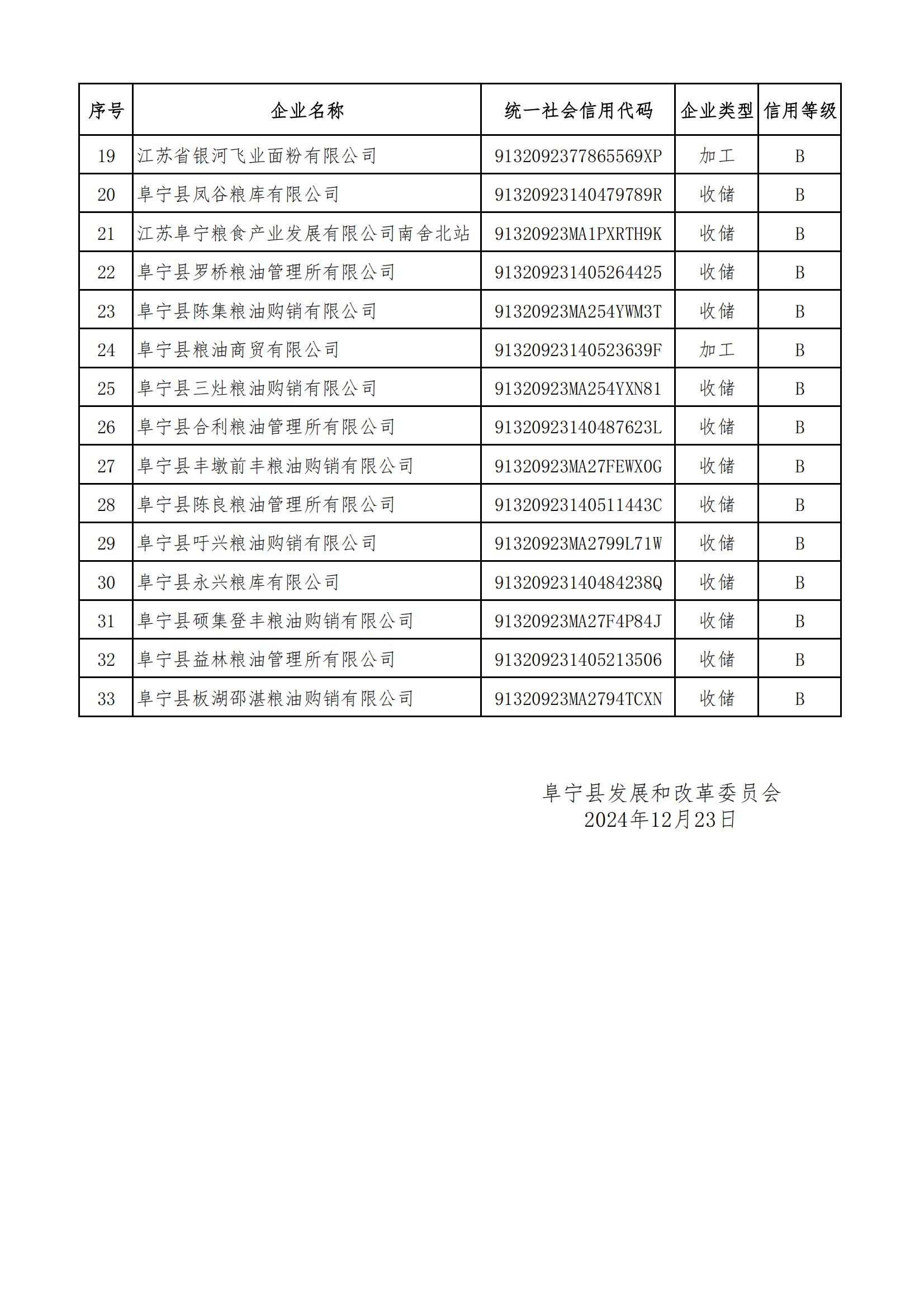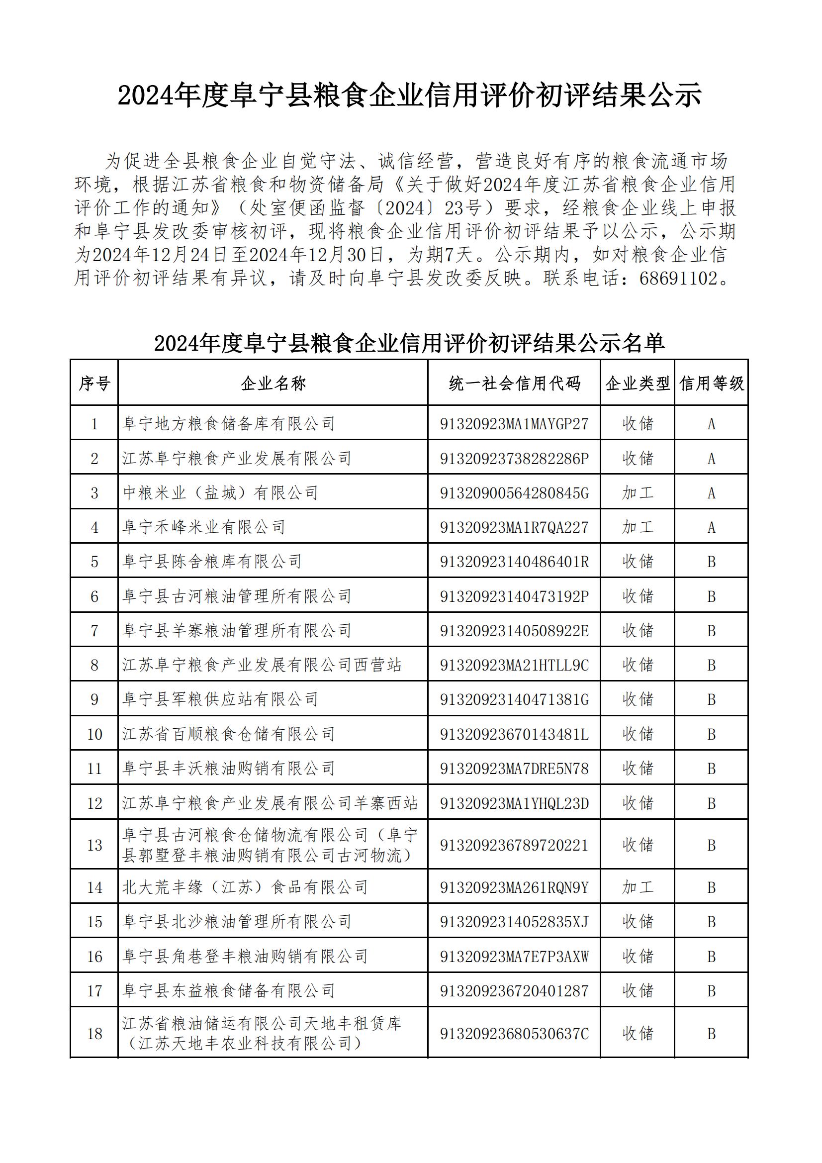 2024年度阜宁县粮食企业信用评价初评结果公示