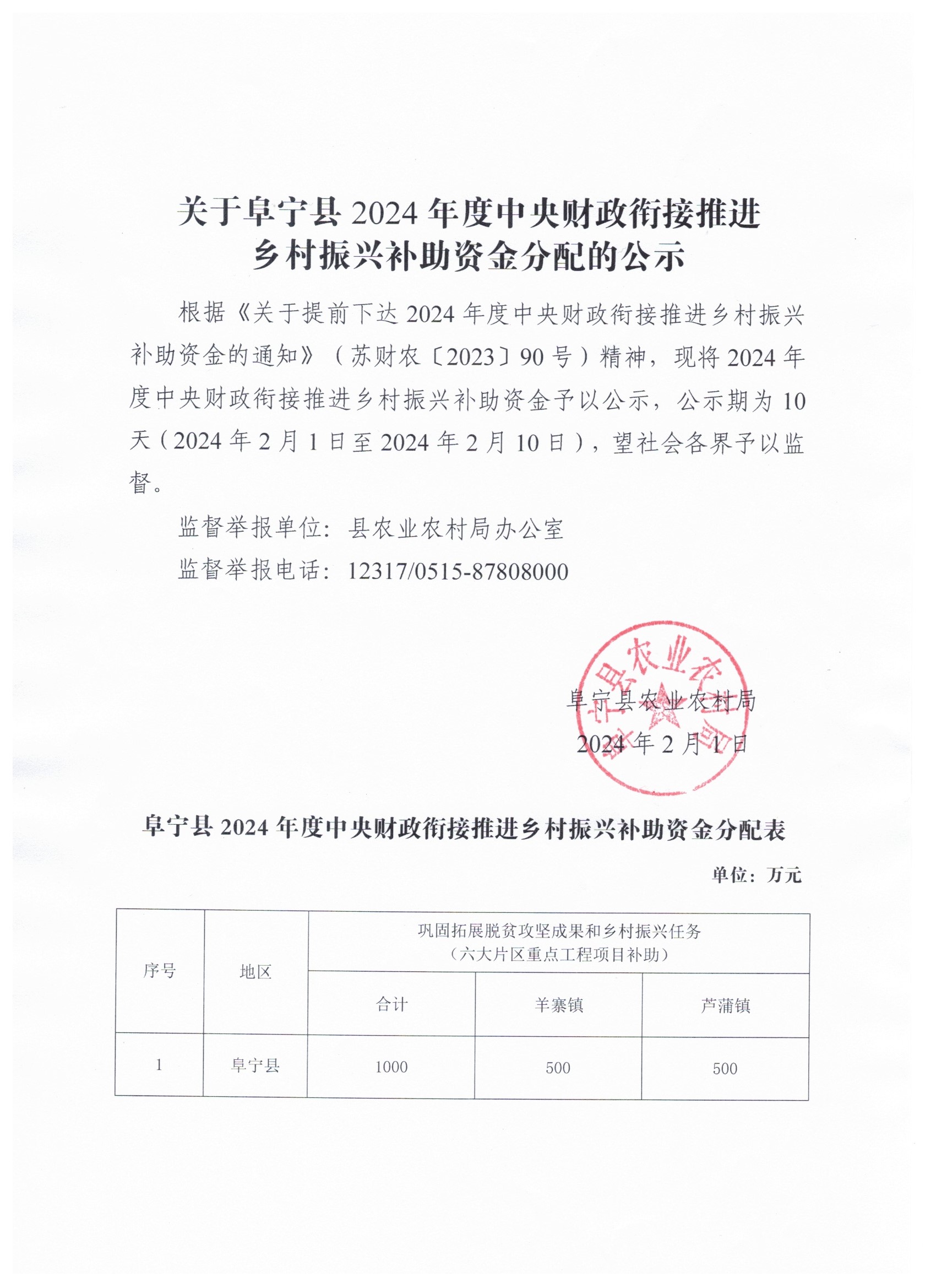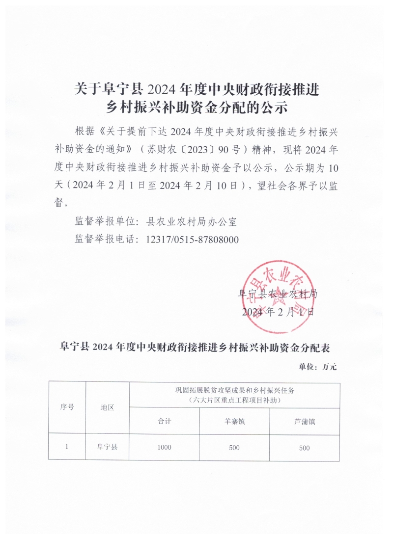 关于阜宁县2024年度中央财政衔接推进乡村振兴补助资金分配的公示