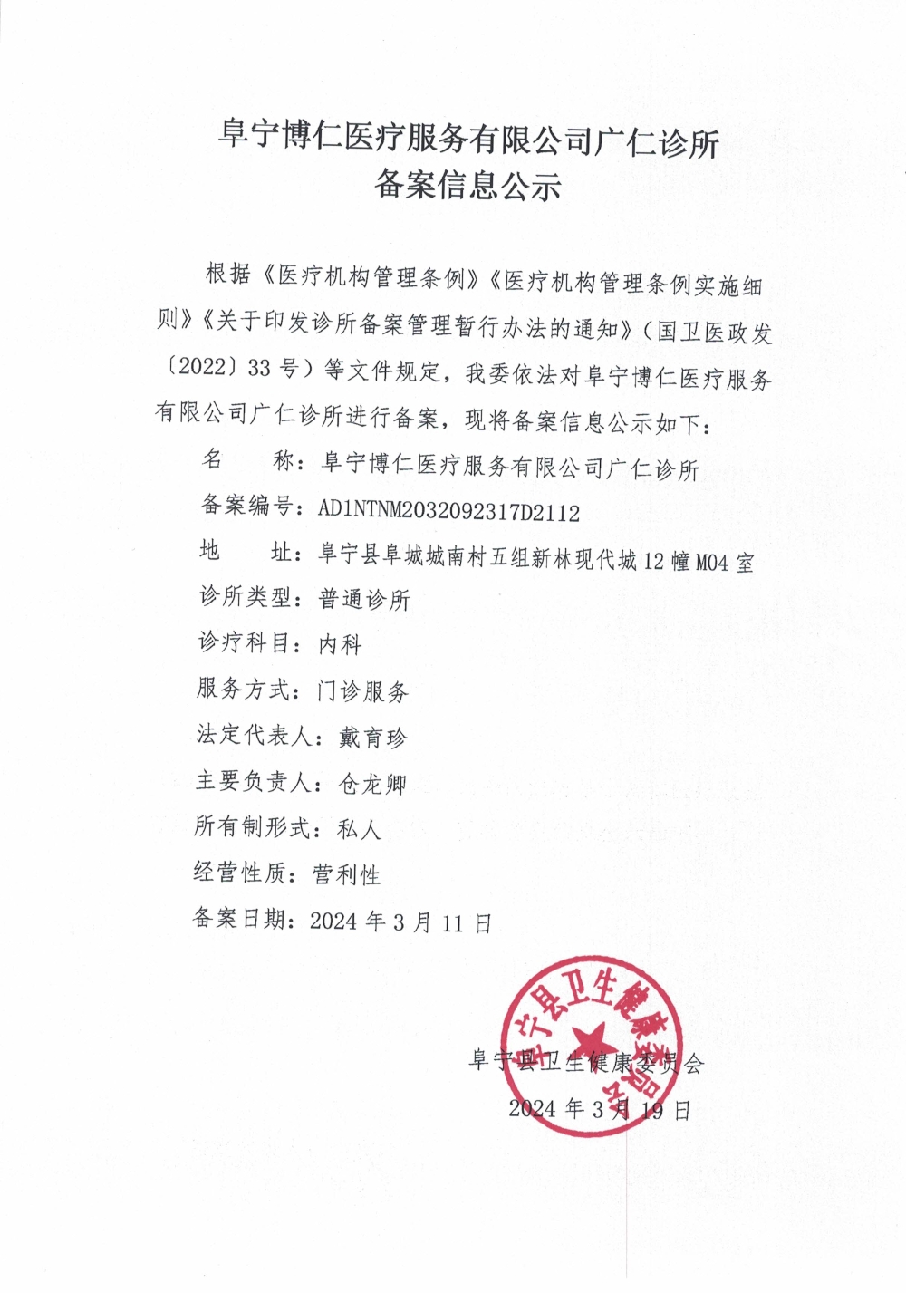 阜宁博仁医疗服务有限公司广仁诊所备案信息公示