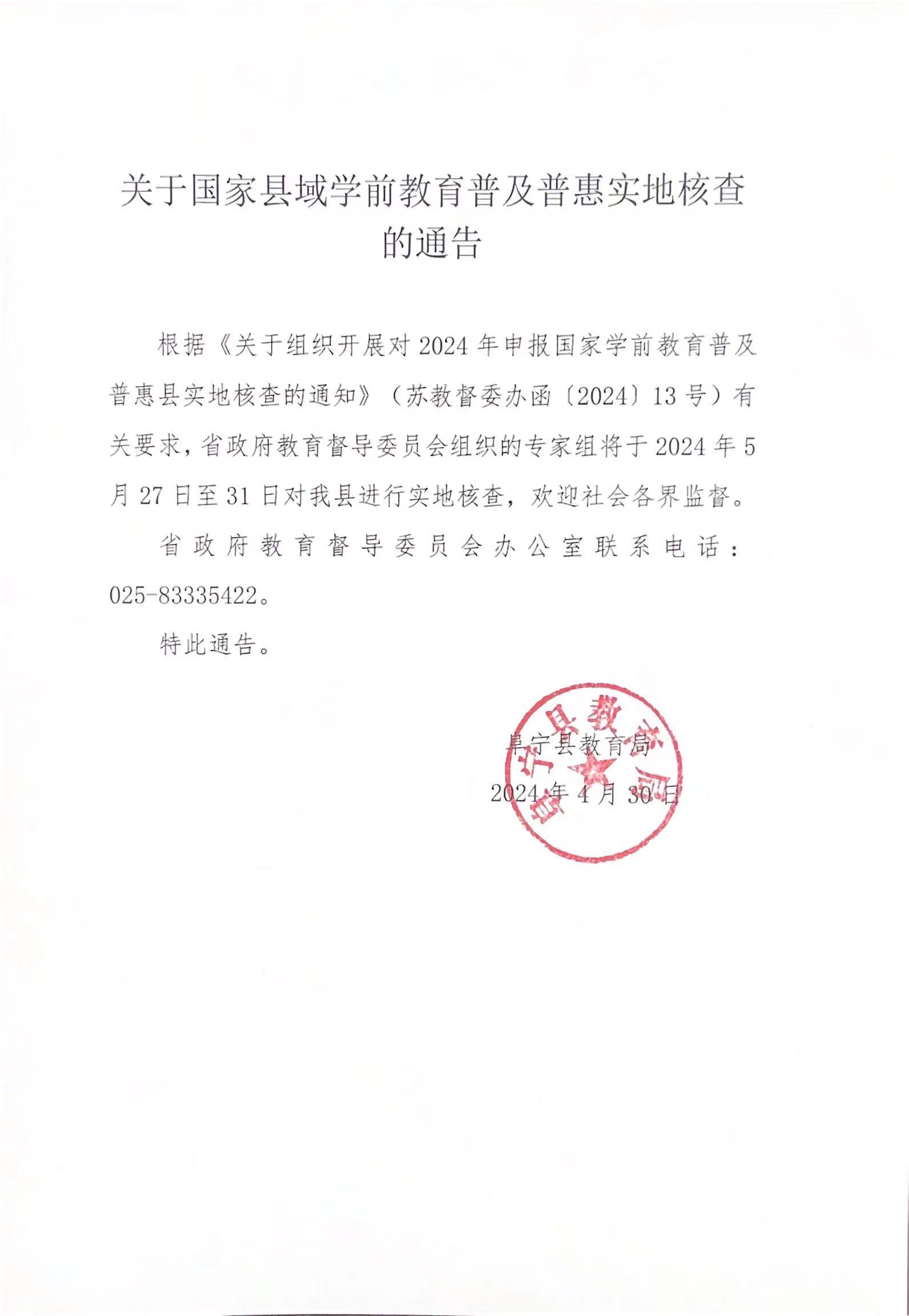 关于国家县域学前教育普及普惠实地核查的通告