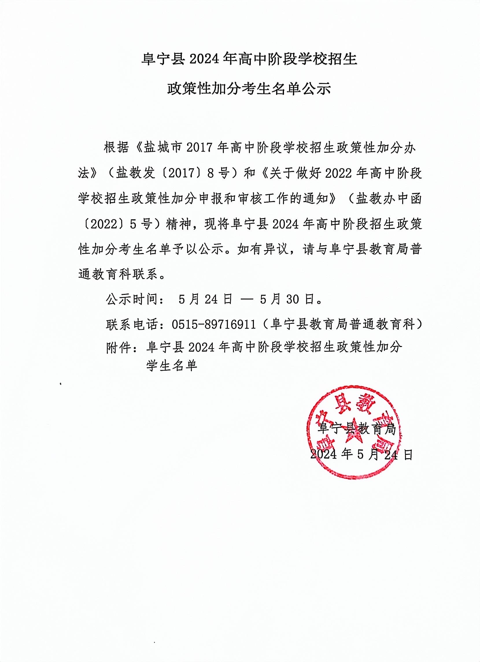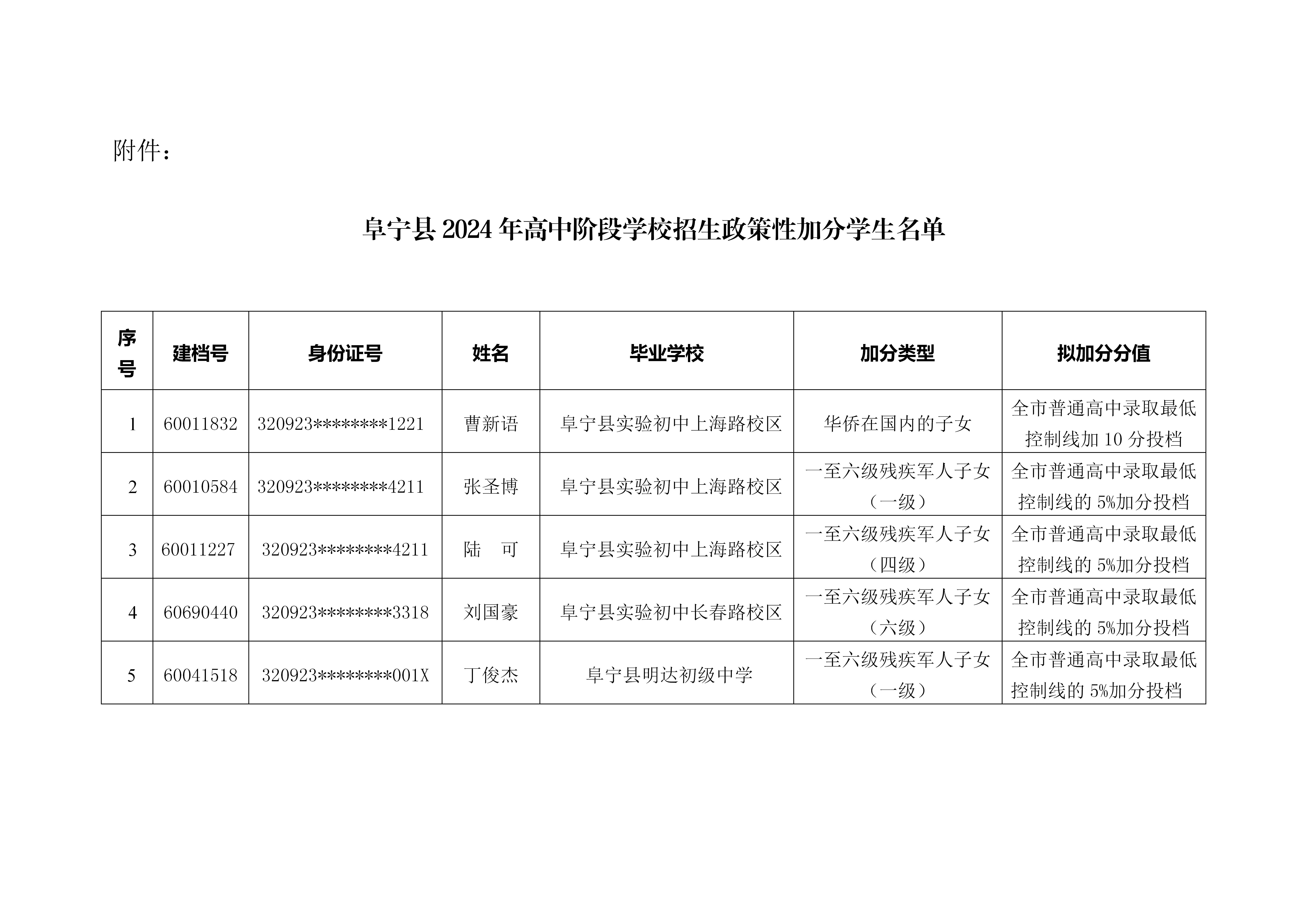 阜宁县2024年高中阶段学校招生政策性加分考生名单公示