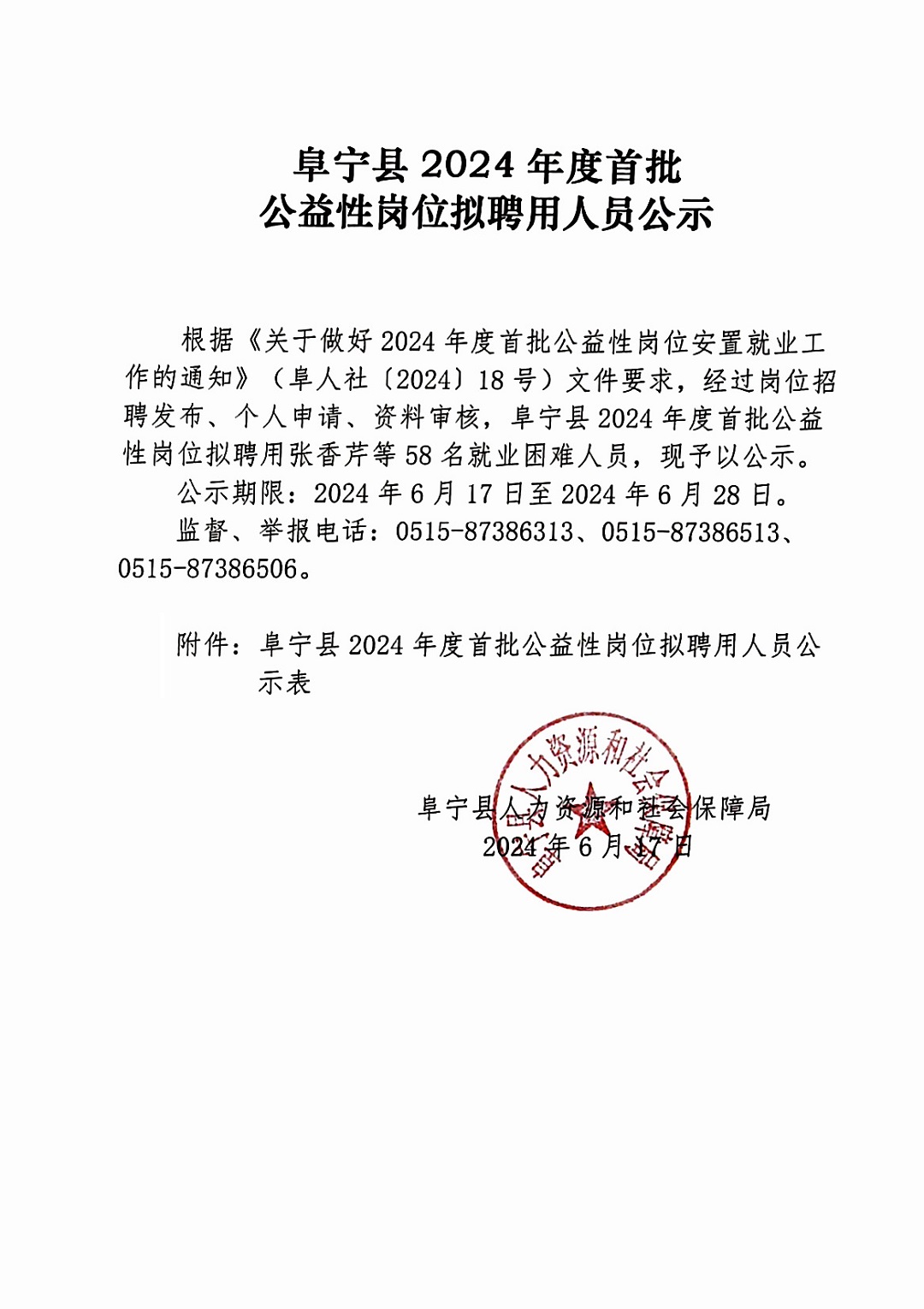 阜宁县2024年度首批公益性岗位拟聘用人员公示