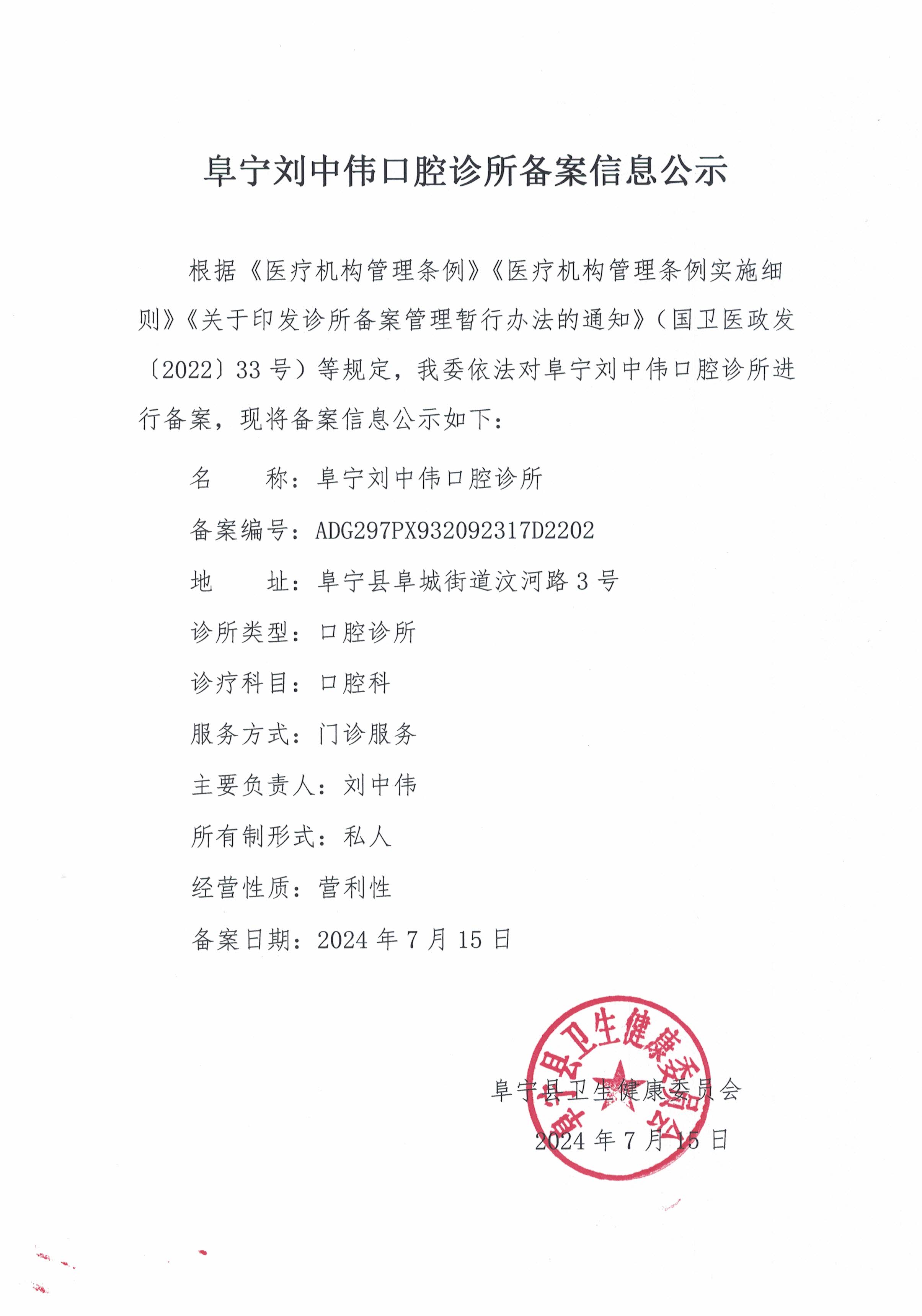 阜宁刘中伟口腔诊所备案信息公示