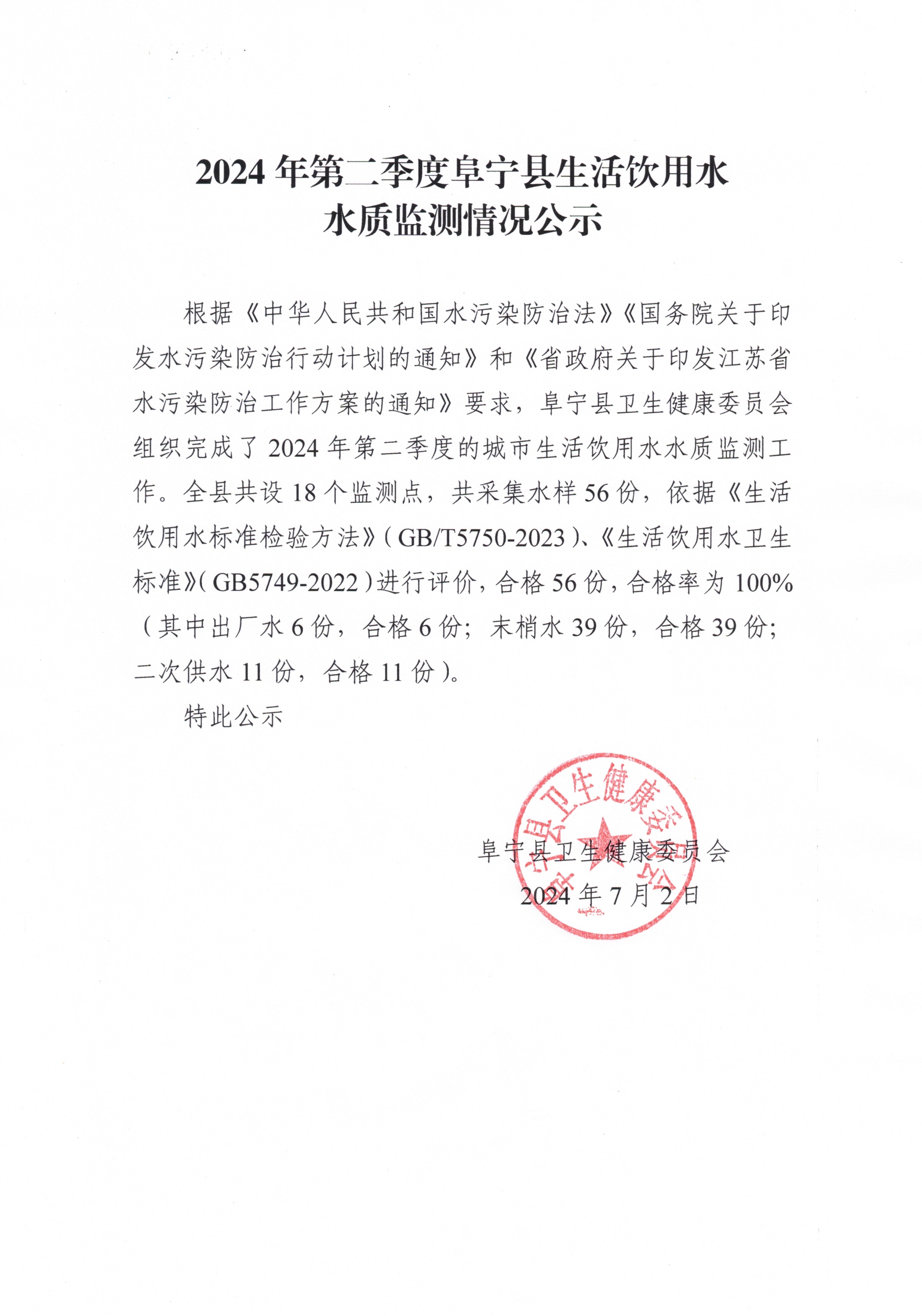 2024年第二季度阜宁县生活饮用水水质监测情况公示