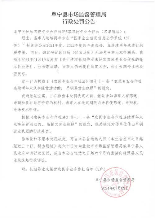 阜宁县市场监督管理局行政处罚公告(农民专业合作社)