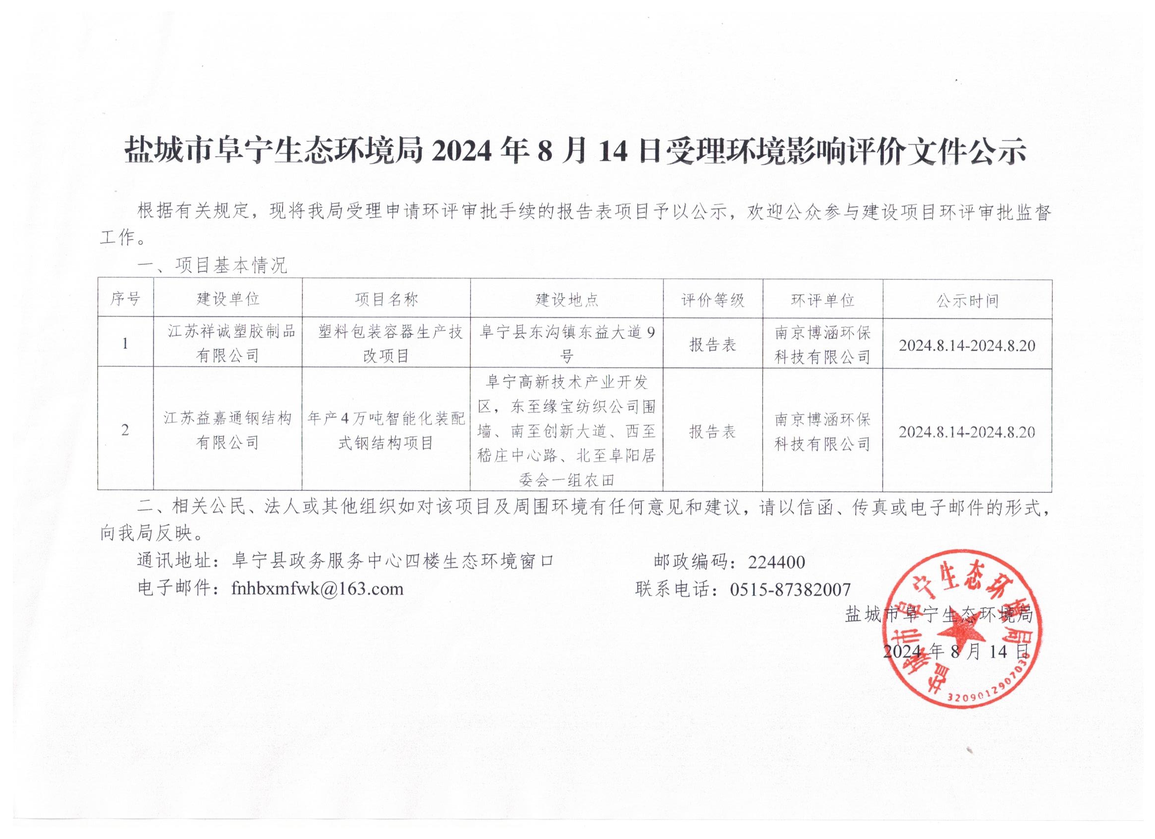 盐城市阜宁生态环境局2024年8月14日受理环境影响评价文件公示