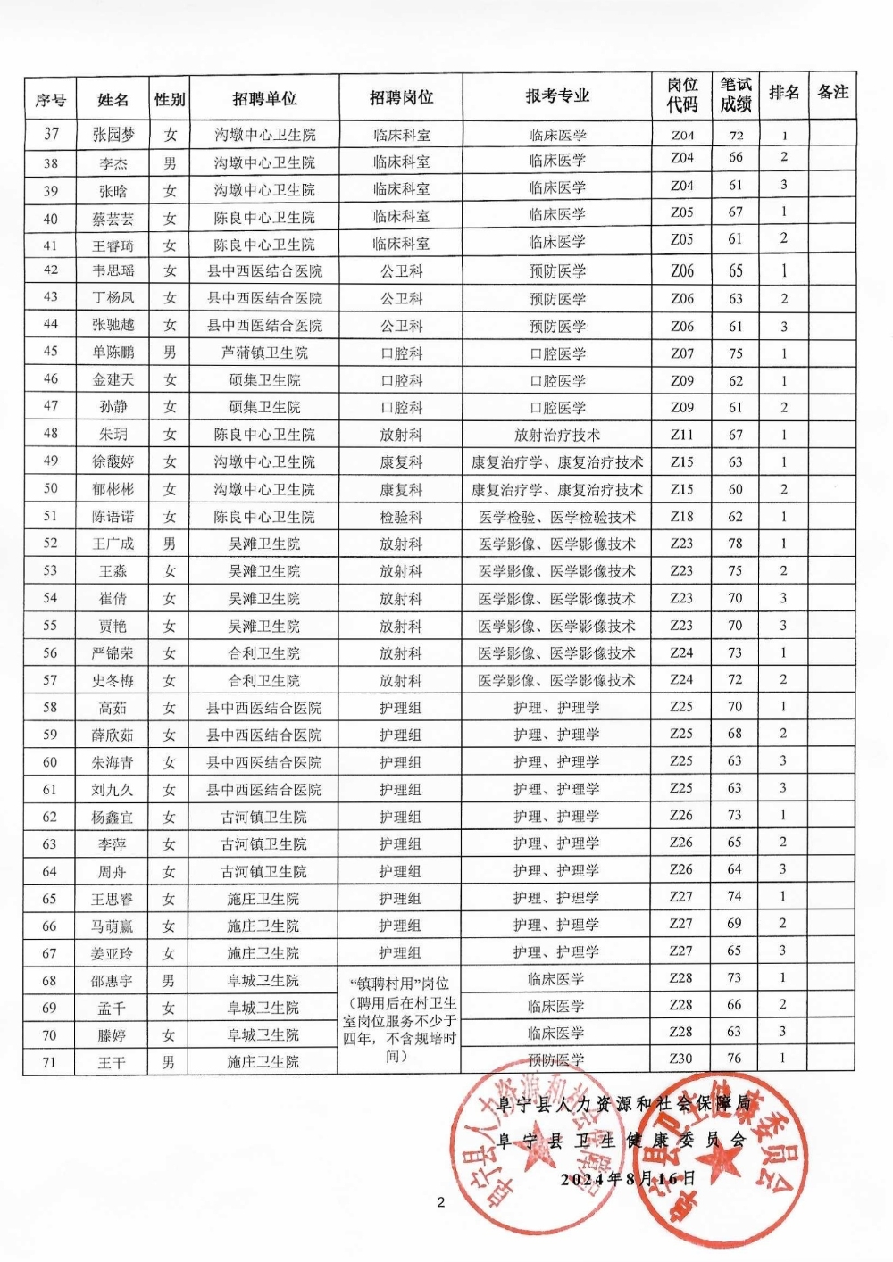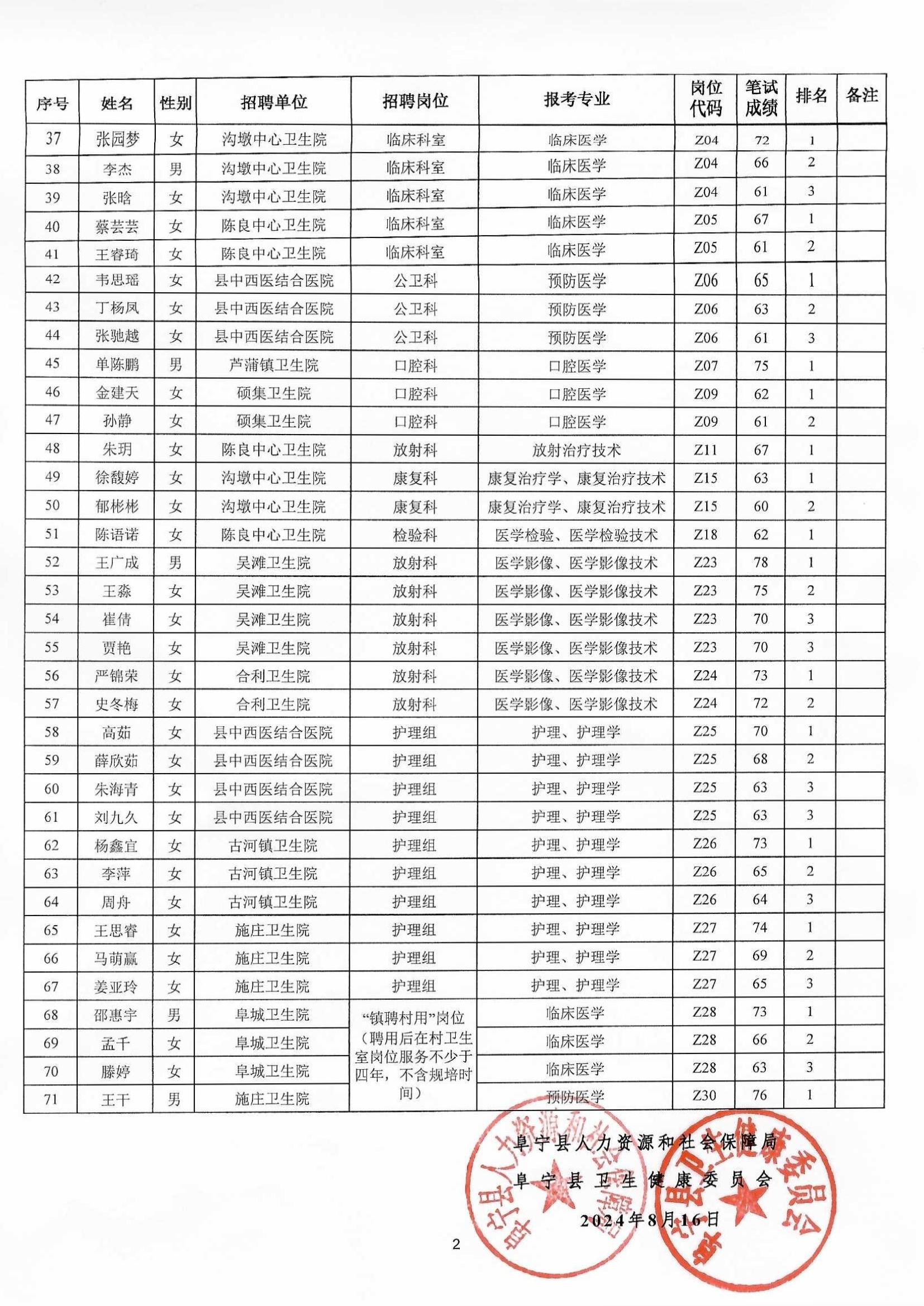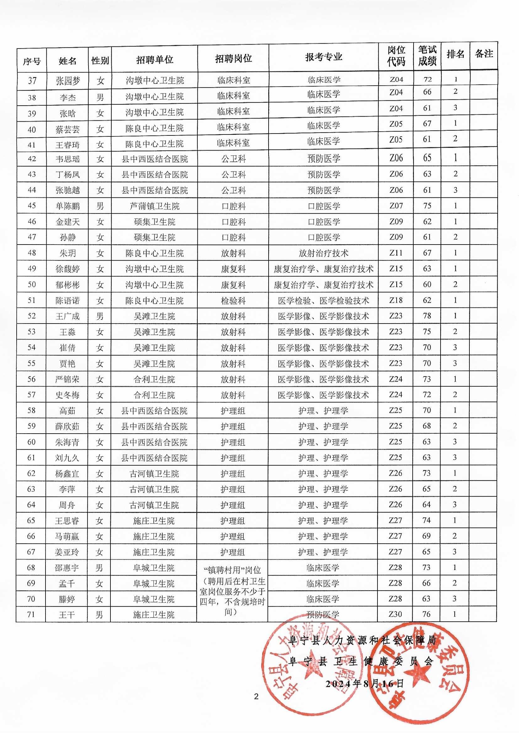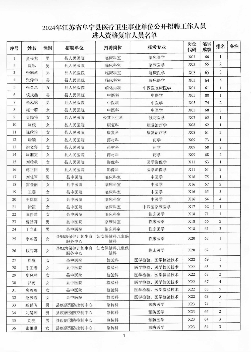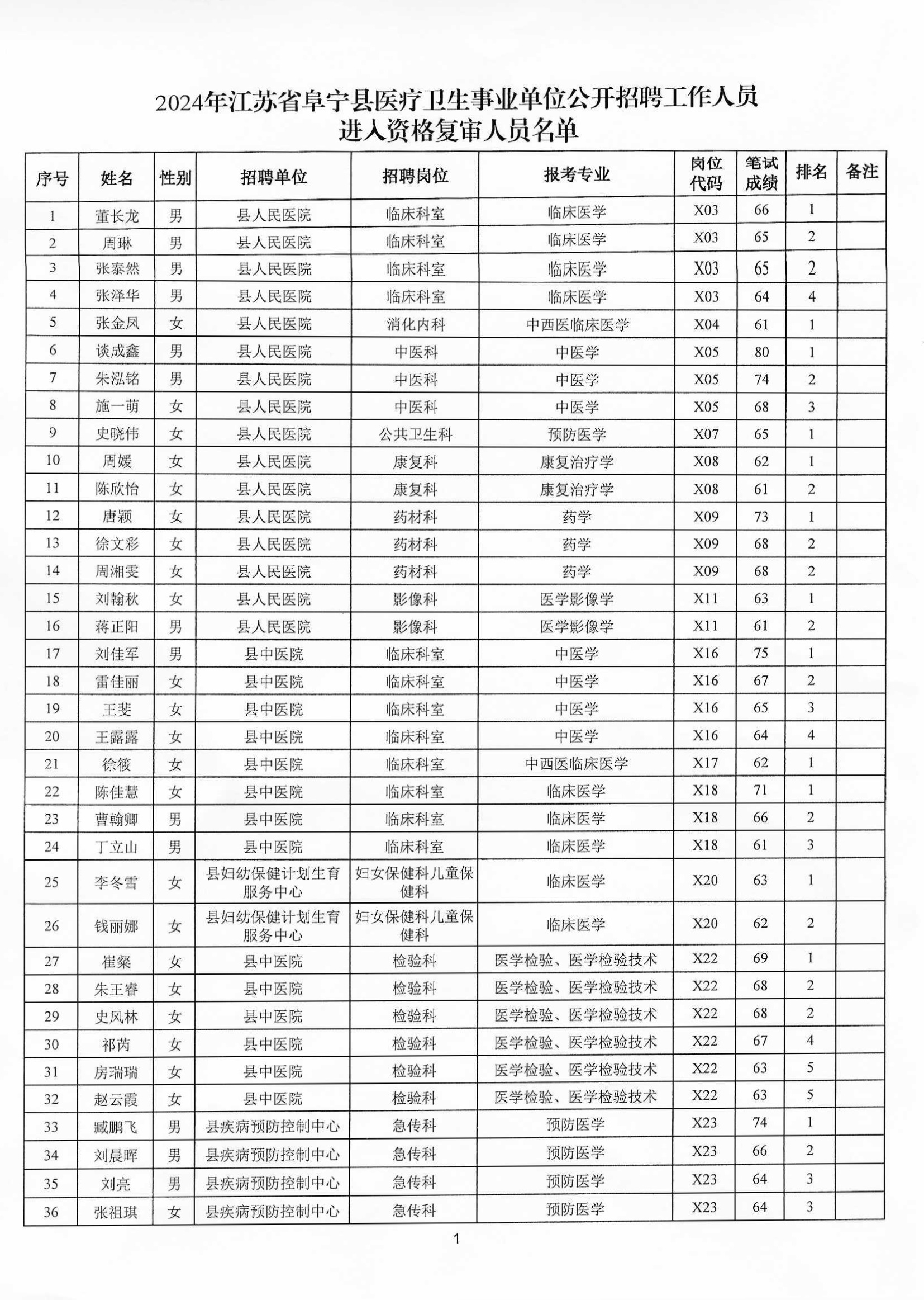 2024年江苏省阜宁县医疗卫生事业单位公开招聘工作人员进入资格复审人员名单